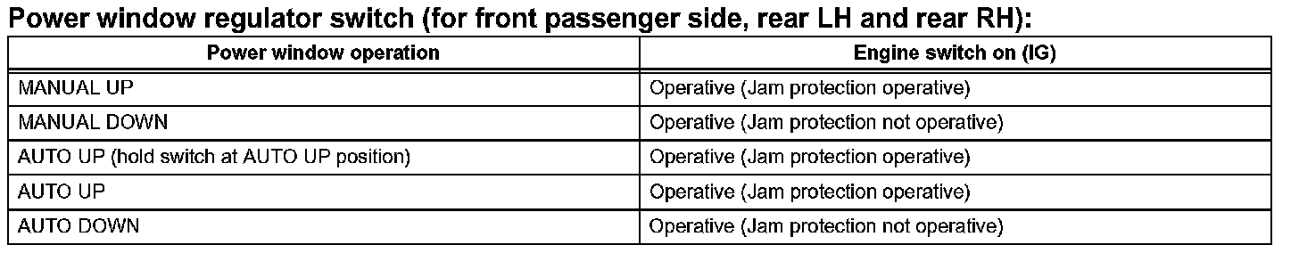 a. The power window control system prohibits the following power window operation when the pulse sensor for the jam protection function has problems and the window position or the learned value is abnormal.