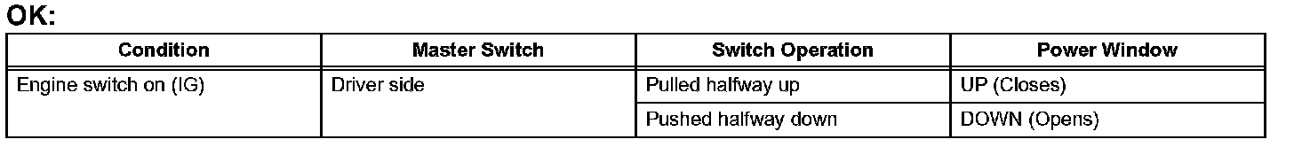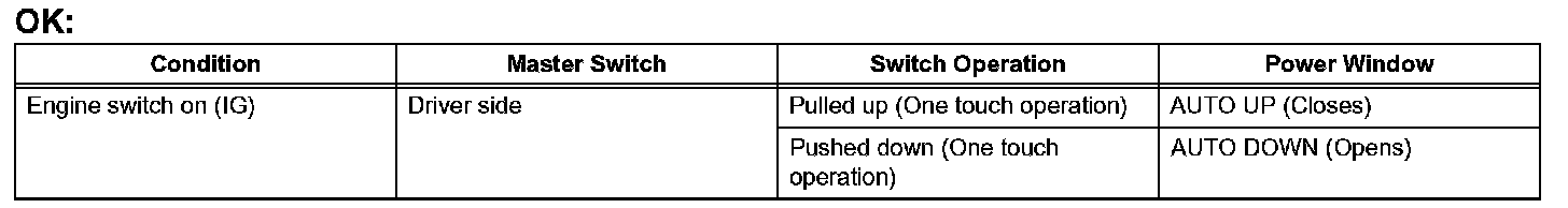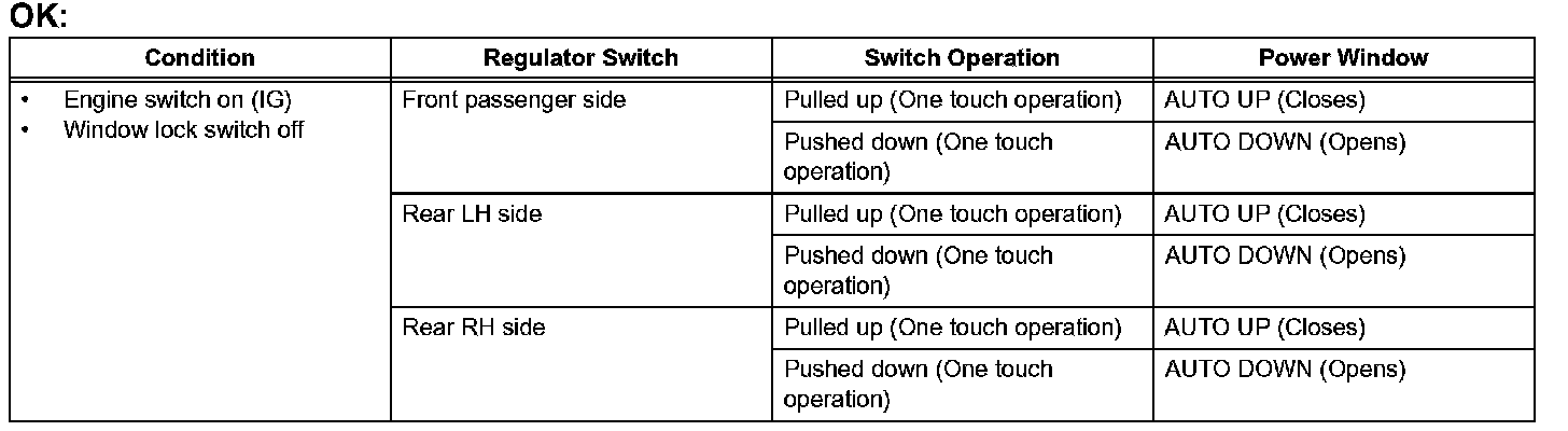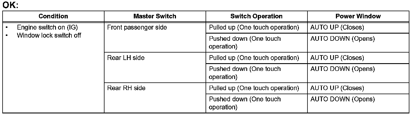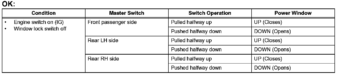b. Check that the front passenger side and rear the power windows operate as follows: