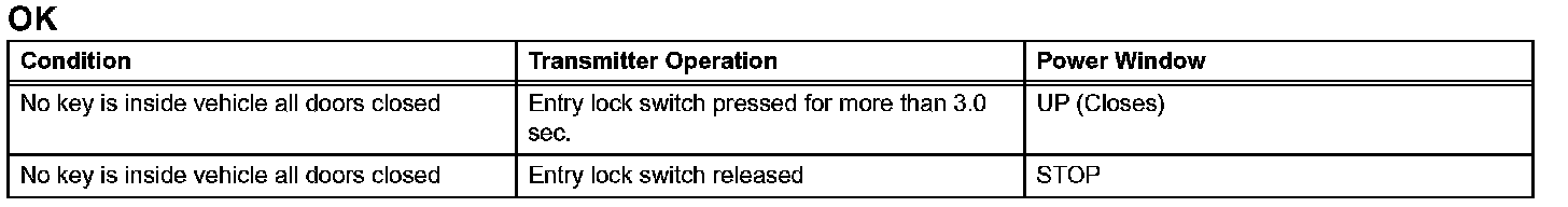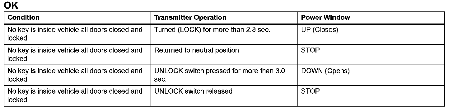 OK: Operation of front passenger side power window and rear power windows are disabled.