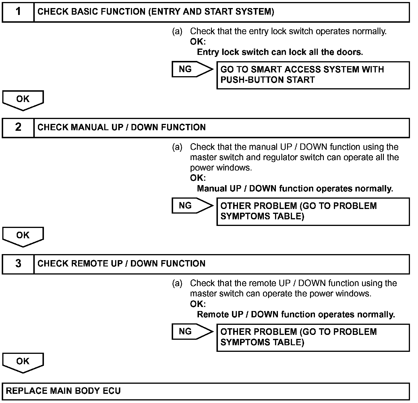 When an entry lock switch is pressed and held for approximately 3 seconds: 1) the main body ECU receives a signal via the driver side door ECU, 2) the main body ECU transmits a signal to all the power window regulator motor, and 3) all the power window motors are activated to close the windows.