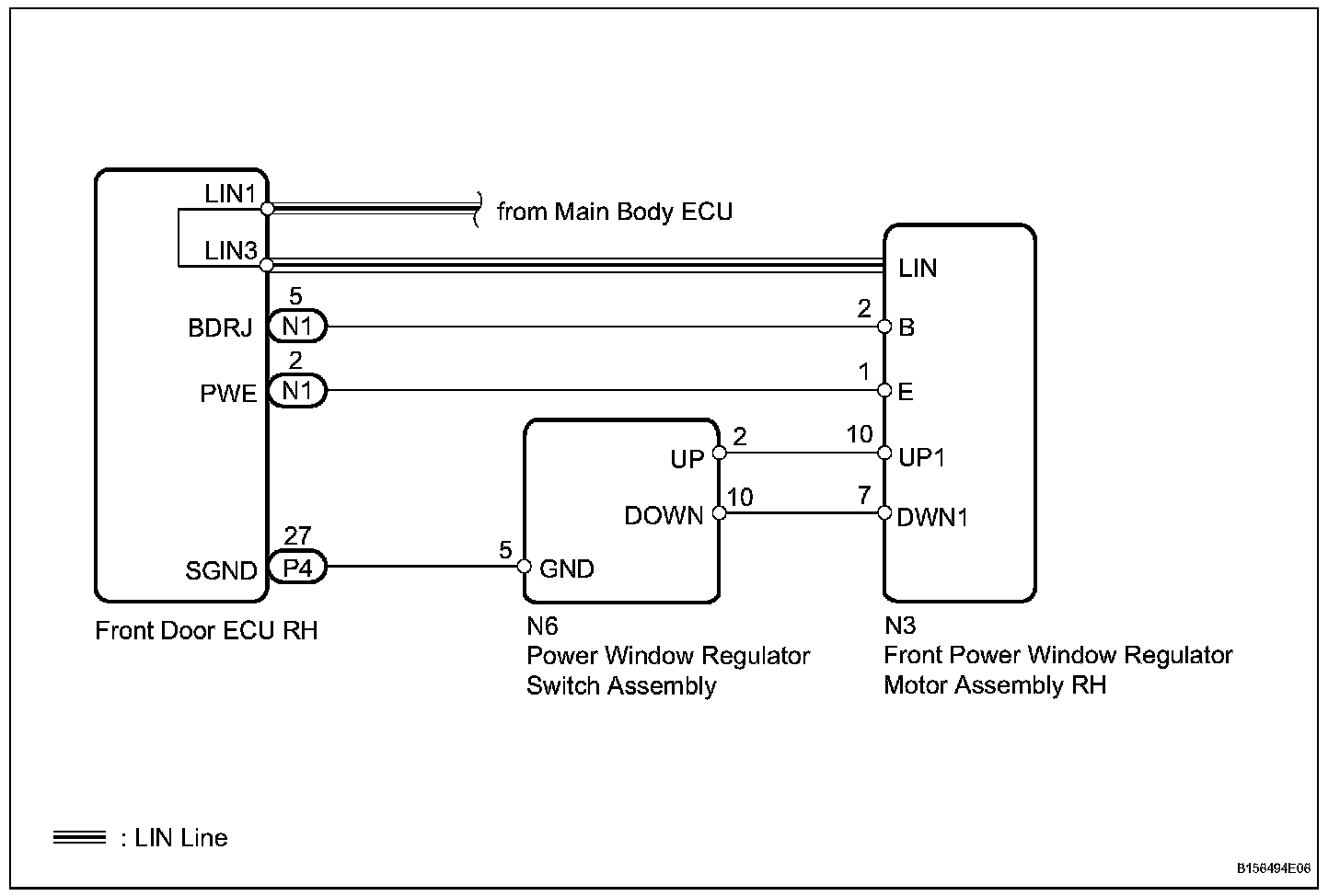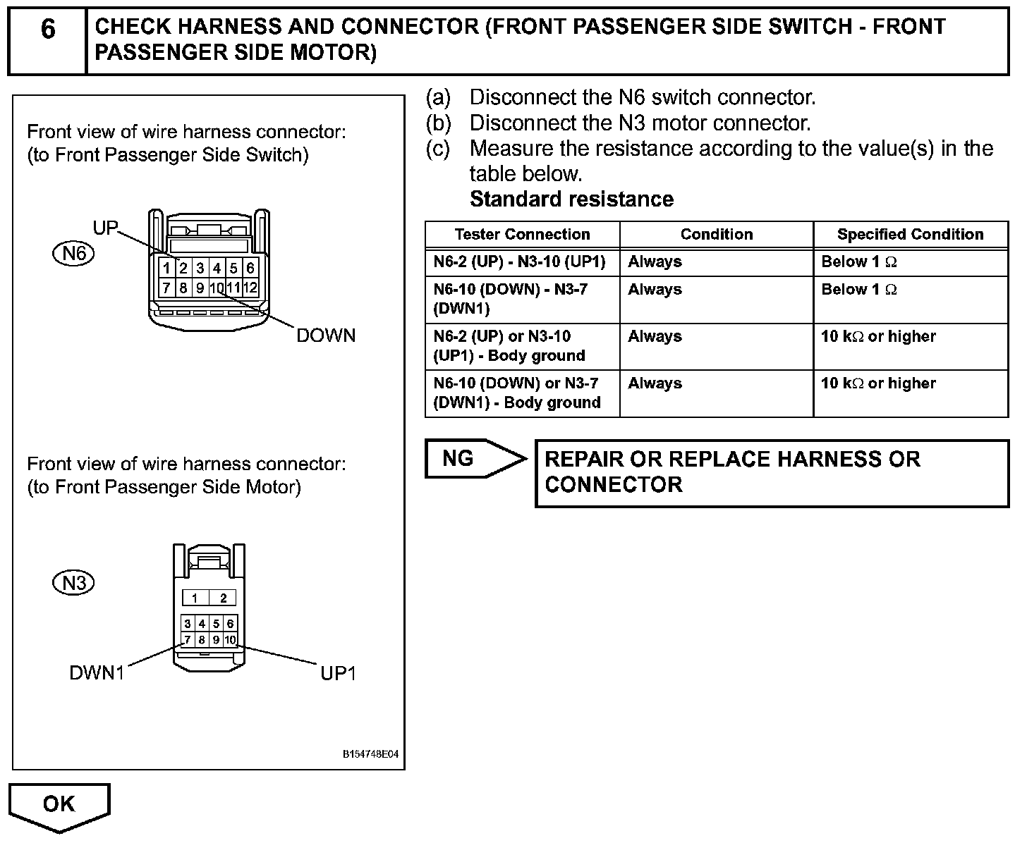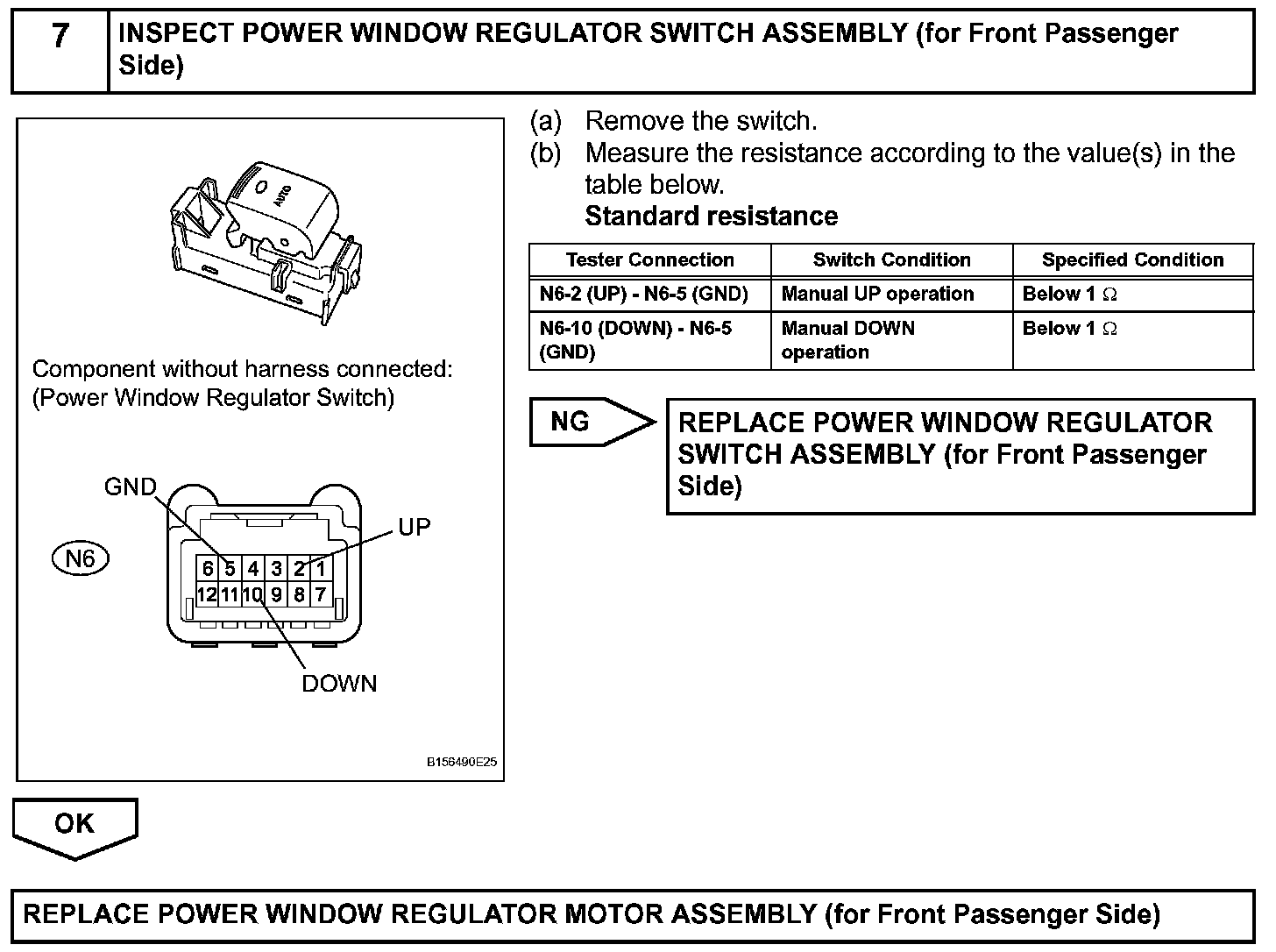If the manual UP / DOWN function does not operate, there may be a malfunction in the power window regulator switch, front power window regulator motor RH or wire harness.