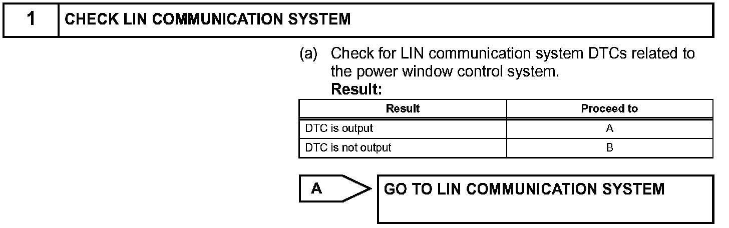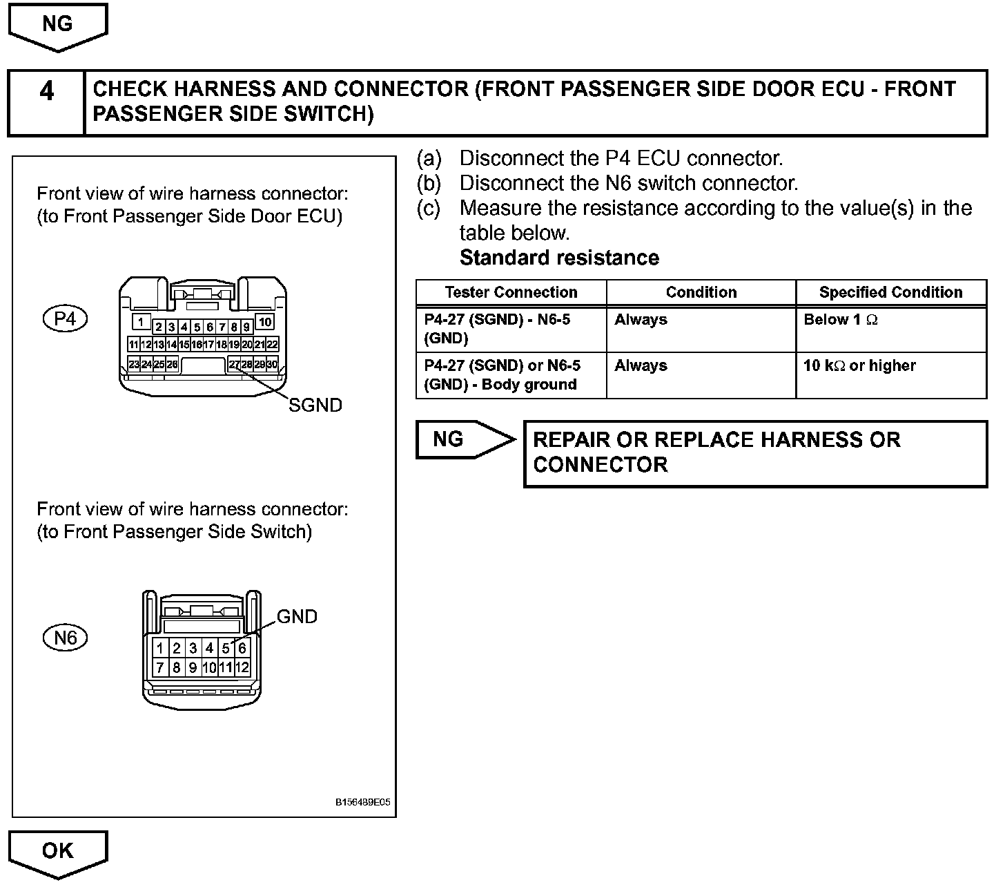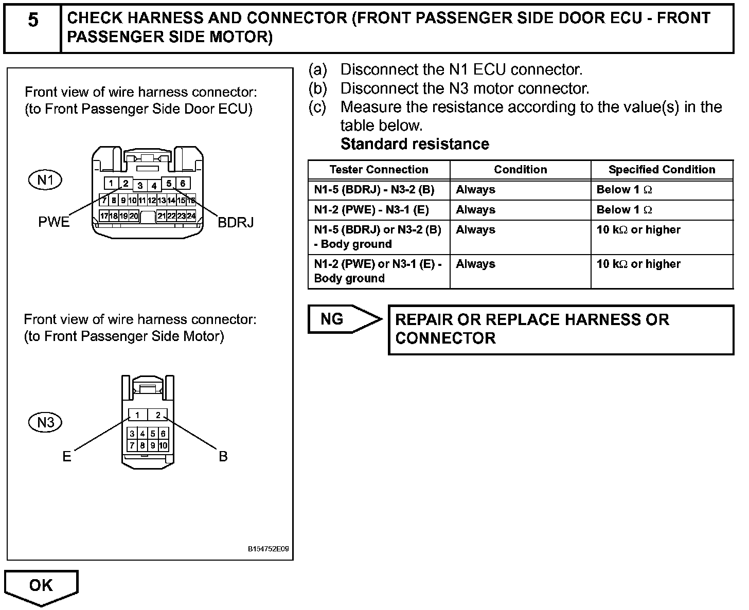 If the manual UP / DOWN function does not operate, there may be a malfunction in the power window regulator switch, front power window regulator motor RH or wire harness.