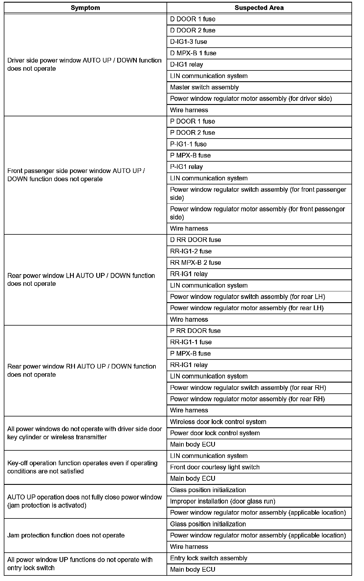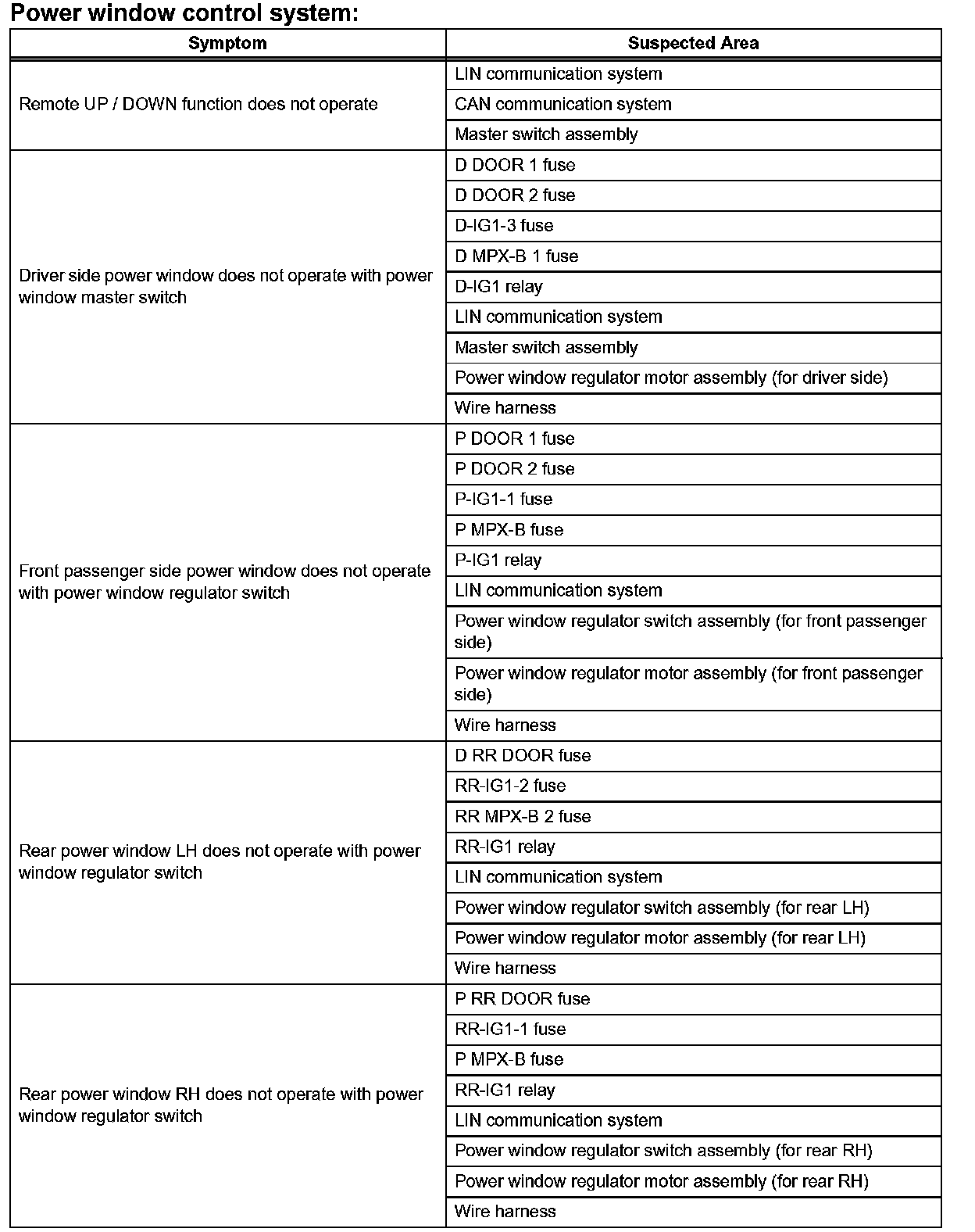 - Inspect the fuses and relays related to the system before inspecting the suspected areas below.