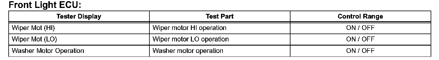 NOTE: When a BODY (front light ECU) related vehicle switch is ON, Active Test items related to the vehicle switch are prohibited (double operation prohibition). Check that the vehicle switches are OFF before performing Active Tests.