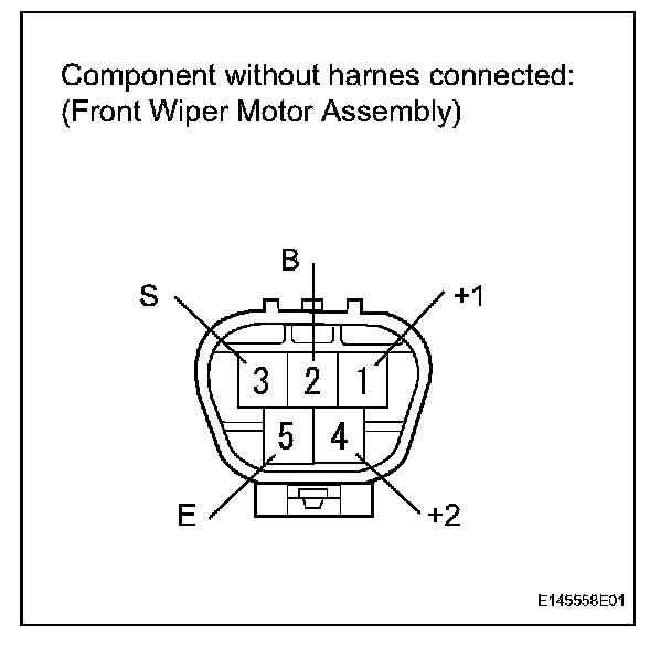 1. Connect the positive (+) battery lead to terminal 5 (+1) of the connector and the negative (-) battery lead to terminal 4 (E). With the motor operating at low speed (LO), disconnect terminal 5 (+1) to stop the wiper motor operation at any position other than the automatic stop position.