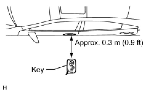 (2) Step 2: Inspect the entry lock operation's detection area and the indoor electrical key antenna for wave leaks. Hold the electrical key at a height of 1 m (3.3 ft) (0.1 m (0.3 ft) above the lower edge of the window frame). Pay attention to the direction and position of the electrical key in the illustration. When the electrical key is approximately 0.3 m (0.9 ft) from the vehicle and the lock switch is pressed, check that the all doors lock and the warning buzzer (for when the electrical key is forgotten) does not sound. If the warning buzzer sounds, the indoor electrical key antenna may have a wave leak.