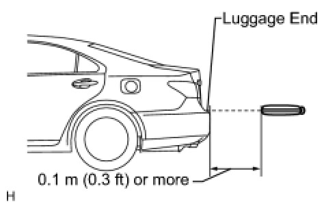 (3) Inspect the electrical key lock-in prevention's detection area and the entry door control receiver for wave leaks. Hold the electrical key at the same height as the lower edge of the luggage compartment door and align the key with the center of the rear of the vehicle. Pay attention to the direction and position of the electrical key shown in the illustration. When the electrical key is over 0.1 m (0.3 ft) from the vehicle's rear bumper, check that the electrical key's wireless buzzer does not sound.