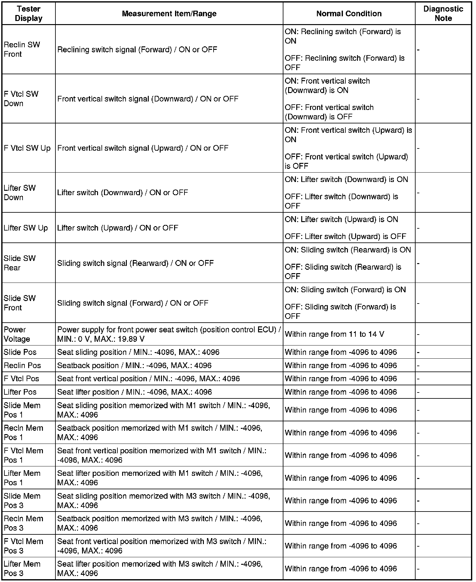 SEAT: FRONT POWER SEAT CONTROL SYSTEM (w/ Seat Position Memory System): DATA LIST / ACTIVE TEST