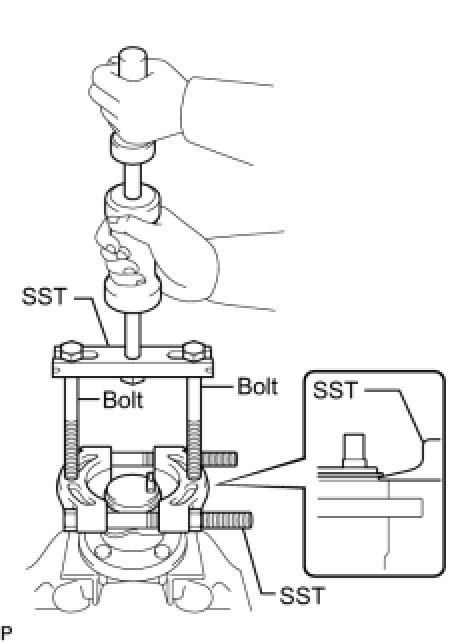 (b) Using a pin punch and hammer, drive out the 2 pins and remove the 2 attachments from SST.