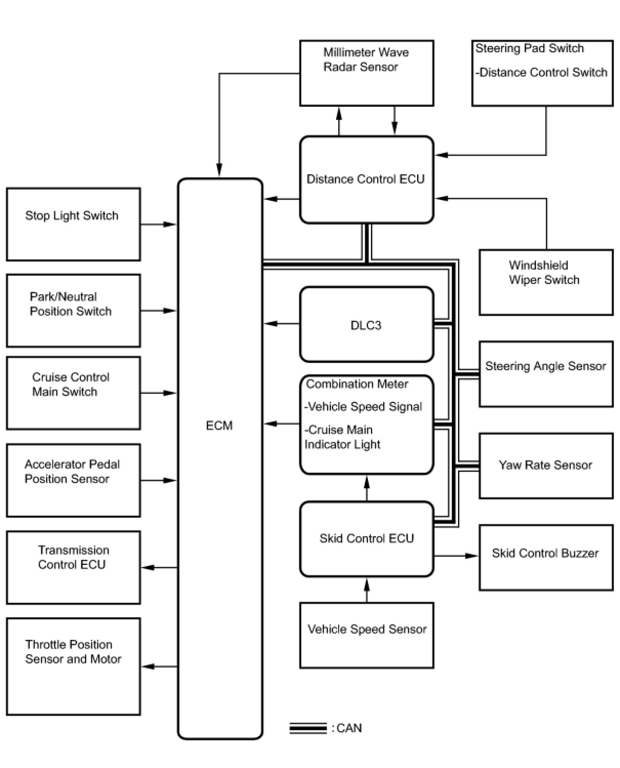 (d) The millimeter wave radar sensor and the distance control ECU control the system while the vehicle-to-vehicle distance control mode is in operation, and send signals to each actuator and ECU.