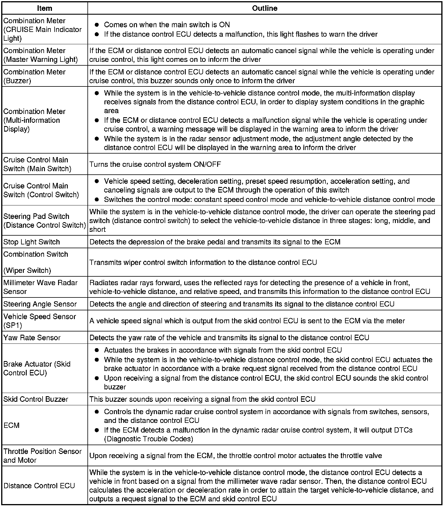 The cruise control main switch operates 8 functions: SET, - (COAST), TAP-DOWN, RES (RESUME), + (ACCEL), TAP-UP, CANCEL, and MODE. The SET, TAP-DOWN, and - (COAST) functions, and the RES (RESUME), TAP-UP, and + (ACCEL) functions are operated with the same switch. The cruise control main switch assembly is an automatic return type switch which turns on only while operating it in the direction of each arrow and turns off after releasing it. The dynamic radar cruise control system has two cruise control modes: the constant speed control mode and vehicle-to-vehicle distance control mode.