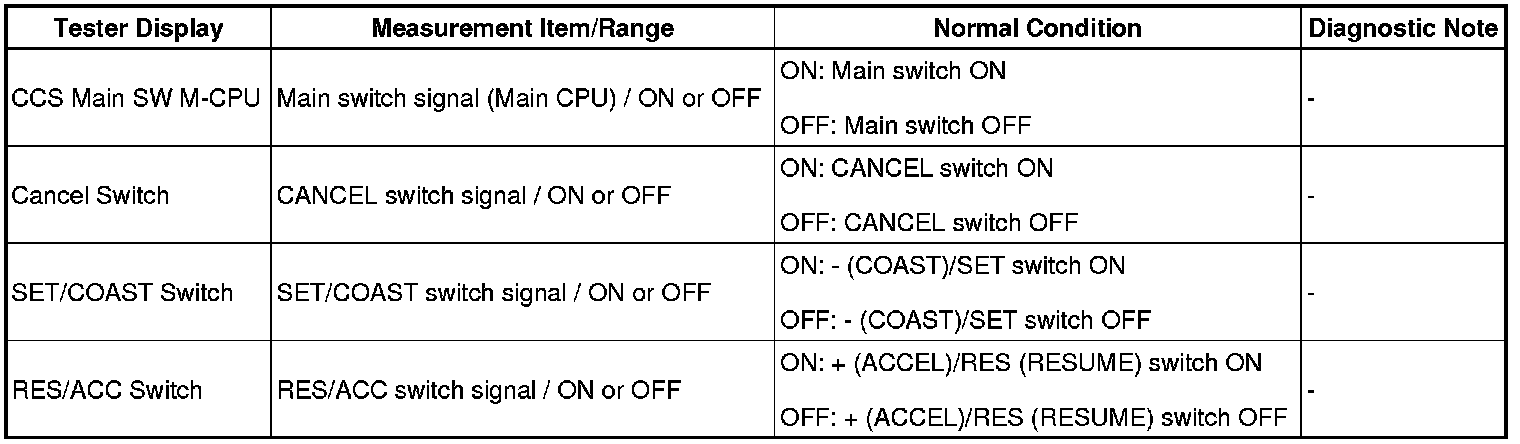 (e) Check the Data List for proper functioning of the cruise control main switch.