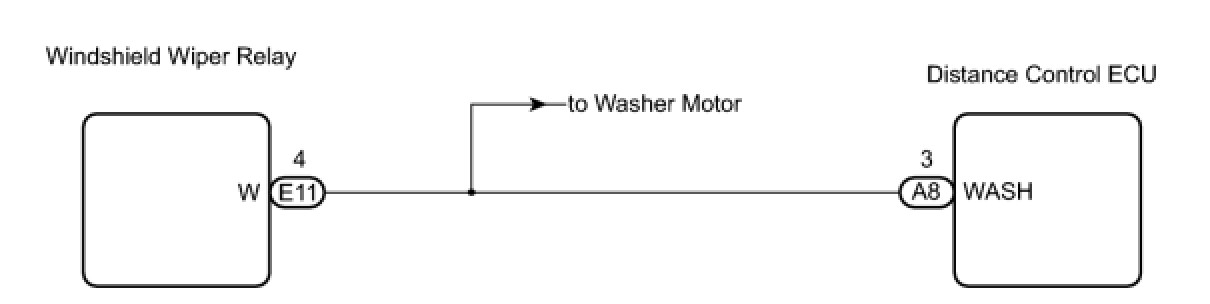 The distance control ECU detects washer operation. The cruise control will be cancelled by the distance control ECU if the windshield wipers operate in HI mode for 5 seconds or more. By detecting washer operation, the distance control ECU allows the cruise control to continue even when the windshield wipers operate in HI mode.