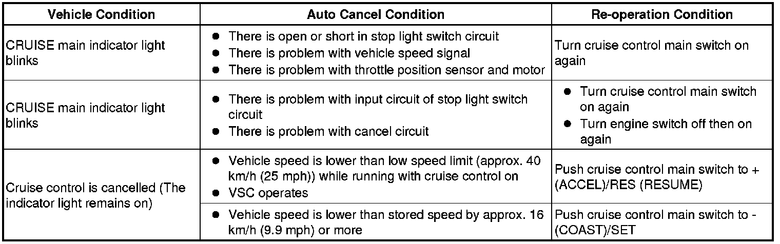 HINT: If the following conditions are detected while the cruise control is in operation, the system clears the stored vehicle speed in the ECM and cancels the cruise control operation.