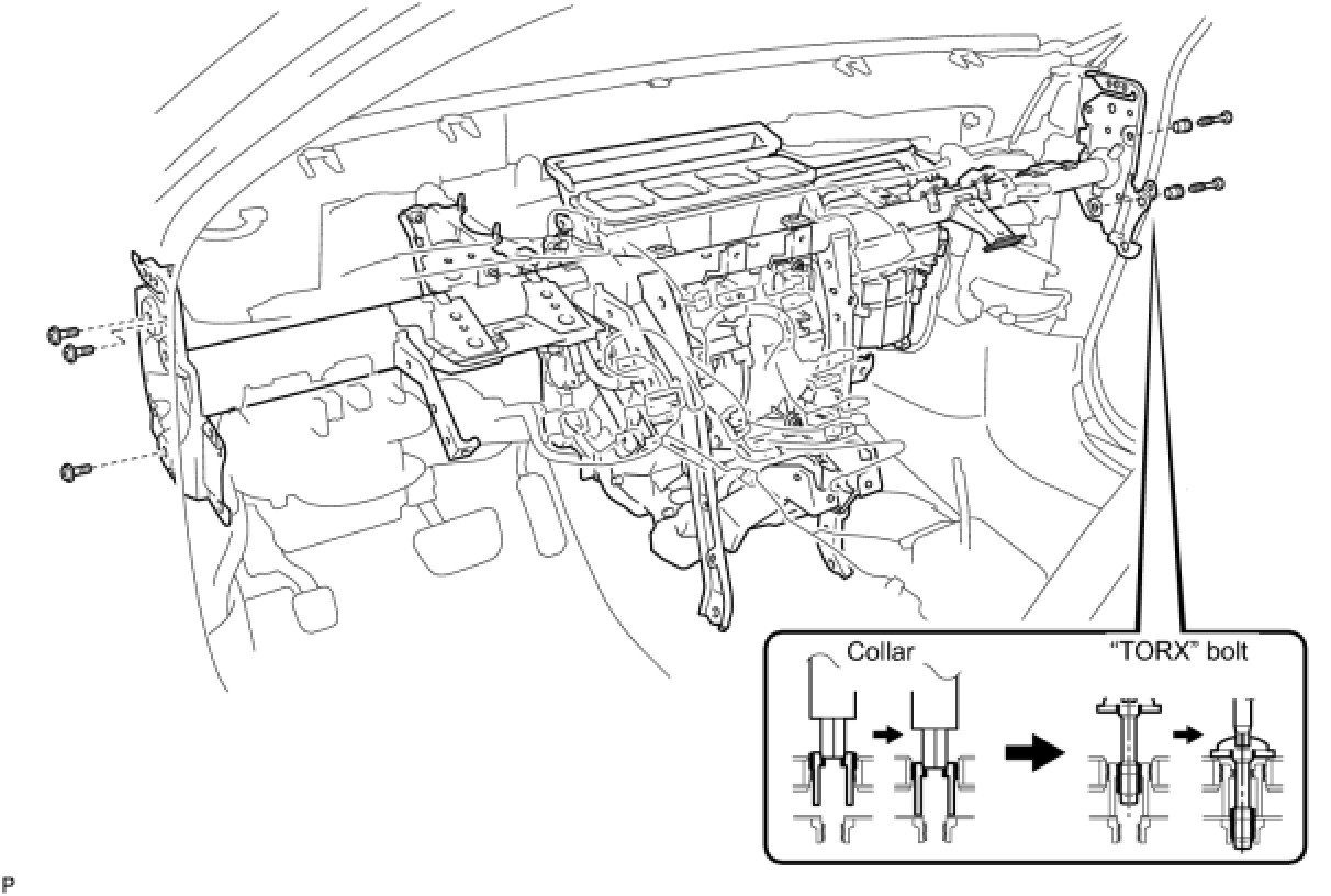 (2) Using a "TORX" socket wrench (T40), install the instrument panel reinforcement assembly with the 2 "TORX" bolts.