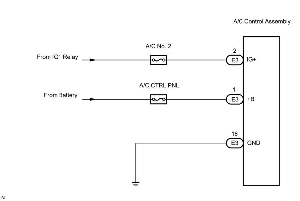 Battery voltage is supplied to the A/C control assembly through the A/C fuse and A/C No. 2 fuse.
