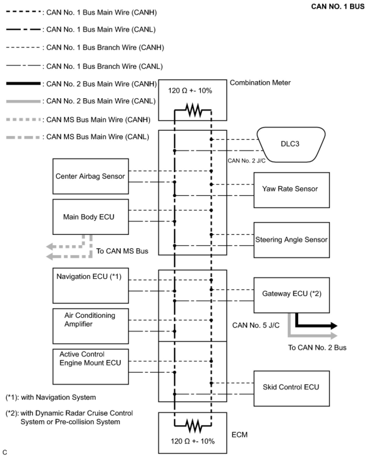 The HS-CAN bus is a high speed communication bus that is used for powertrain, chassis, and some body electrical communication. The HS-CAN bus is referred to as "CAN No. 1 bus" and "CAN No. 2 bus". It operates at speeds of approximately 500 kbps. Terminating resistors for the CAN No. 1 bus are located in the combination meter and ECM. Terminating resistors for the CAN No. 2 bus are located in the gateway ECU and the CAN No. 4 J/C. The resistance of the CAN No. 2 bus cannot be measured from the DLC3 connector.