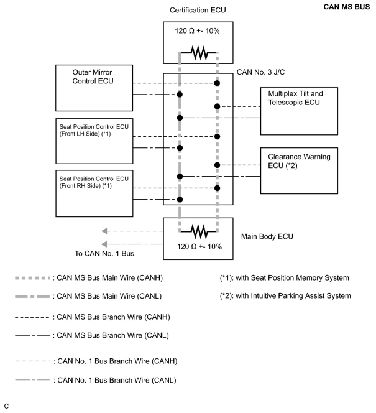 The MS-CAN bus is a medium speed communication bus that is used for body electrical communication. The MS-CAN bus is referred to as "MS bus" and it operates at speeds of approximately 250 kbps. Terminating resistors for the MS-CAN bus are located in the main body ECU and the certification ECU. The resistance of the MS CAN bus cannot be measured from the DLC3 connector.