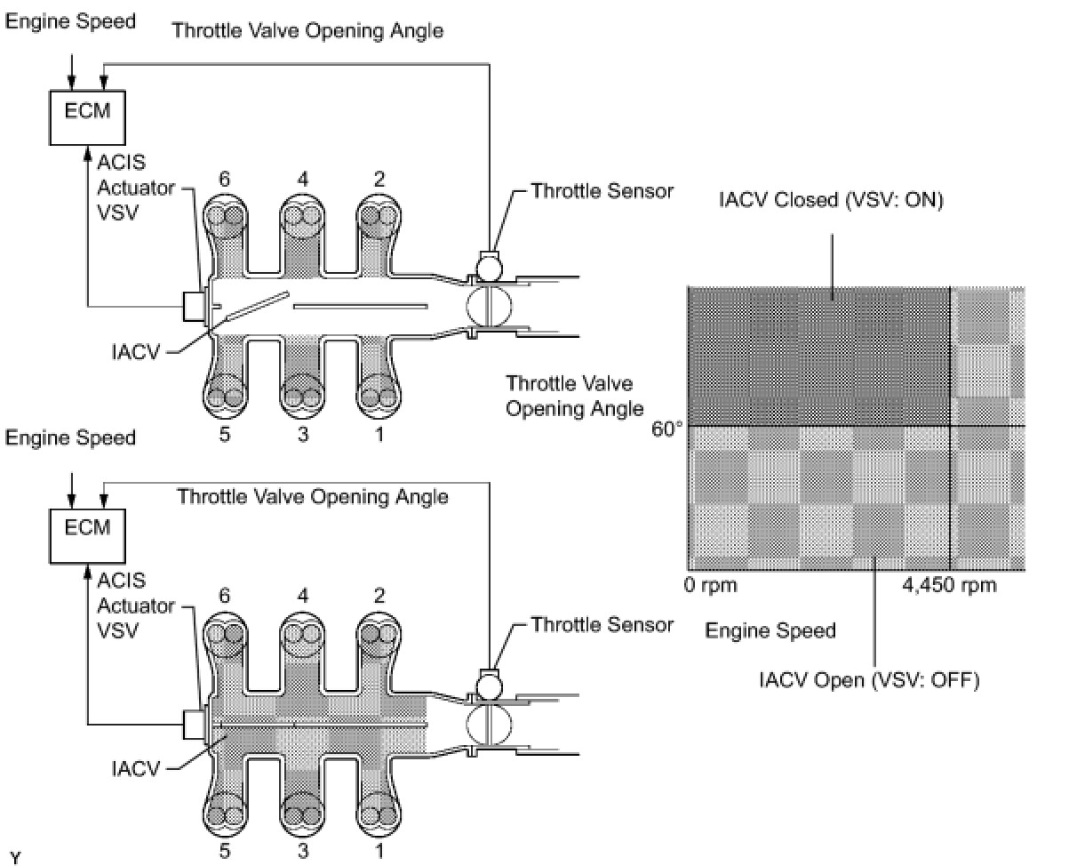When the engine speed is between 0 and 4,450 rpm and the throttle valve opening angle is 60° or more, the ECM supplies current to the VSV (ON status), to close the IACV. Under other conditions, the VSV is usually OFF and the IACV is open.