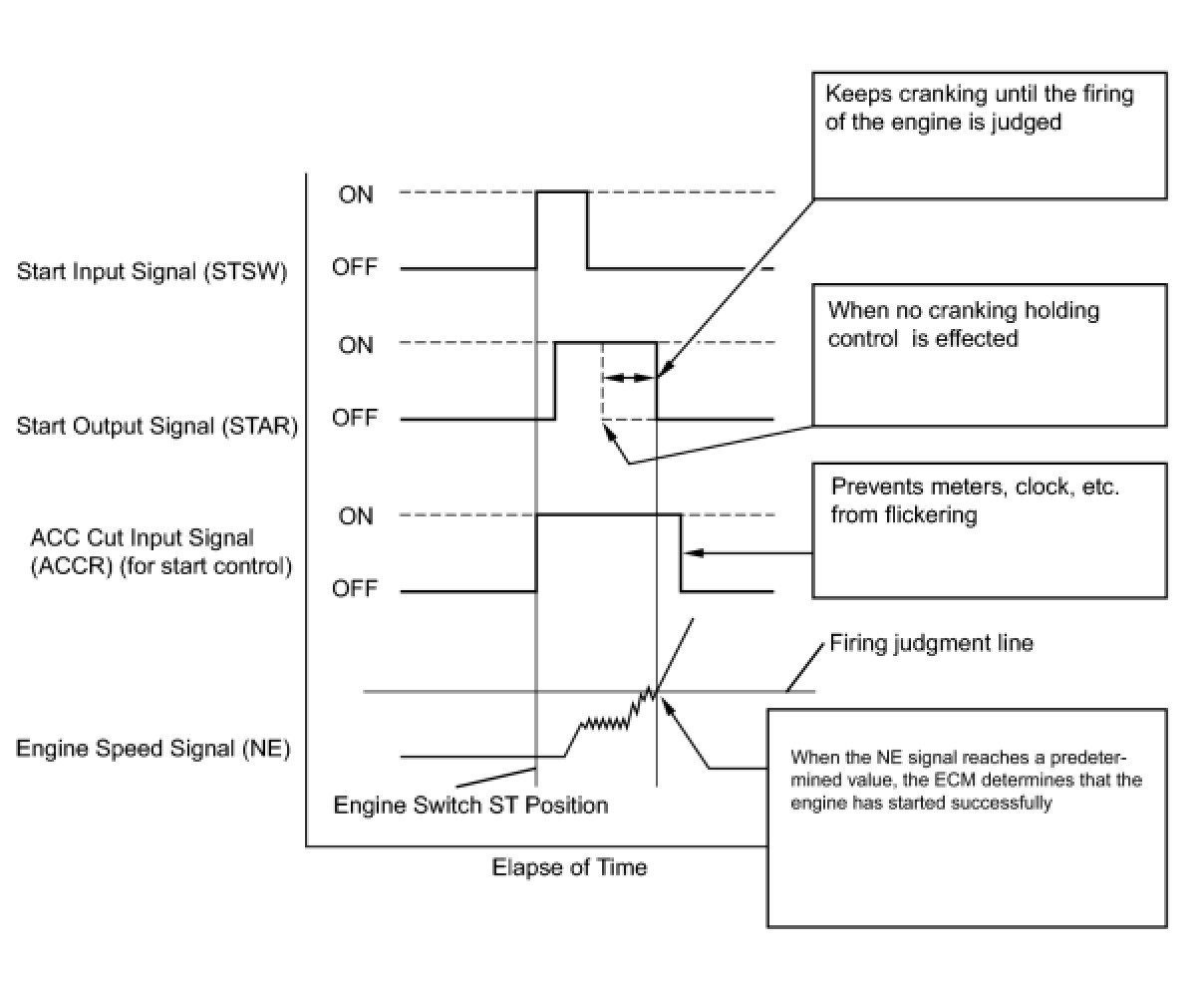 The cranking holding control system provides current to the starter when the ECM detects the engine switch's start signal (STSW). When the ECM performs a firing judgment, the system cuts current to the starter. When the ECM receives the STSW signal, it turns on the ST CUT relay, which prevents flickering of the combination meter, clock, audio system, etc. Also, the ECM sends a signal to the ECM's STAR terminal. Then the STAR output signal travels through the park/neutral position (PNP) switch to the STARTER relay, causing the starter to be activated.