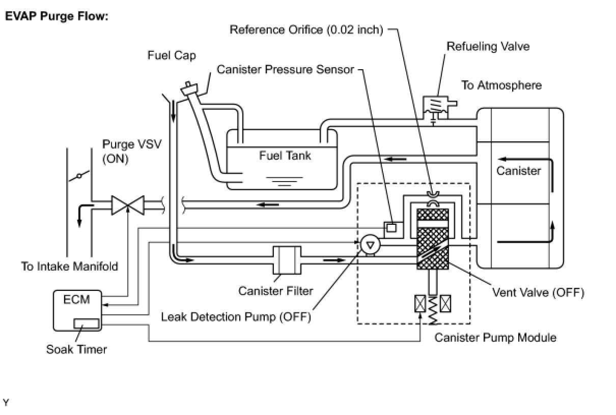 While the engine is running and the purge VSV (Vacuum Switching Valve) is ON (open), the ECM monitors the purge flow by measuring the EVAP pressure change. If negative pressure is not created, the ECM begins the 2nd monitor.