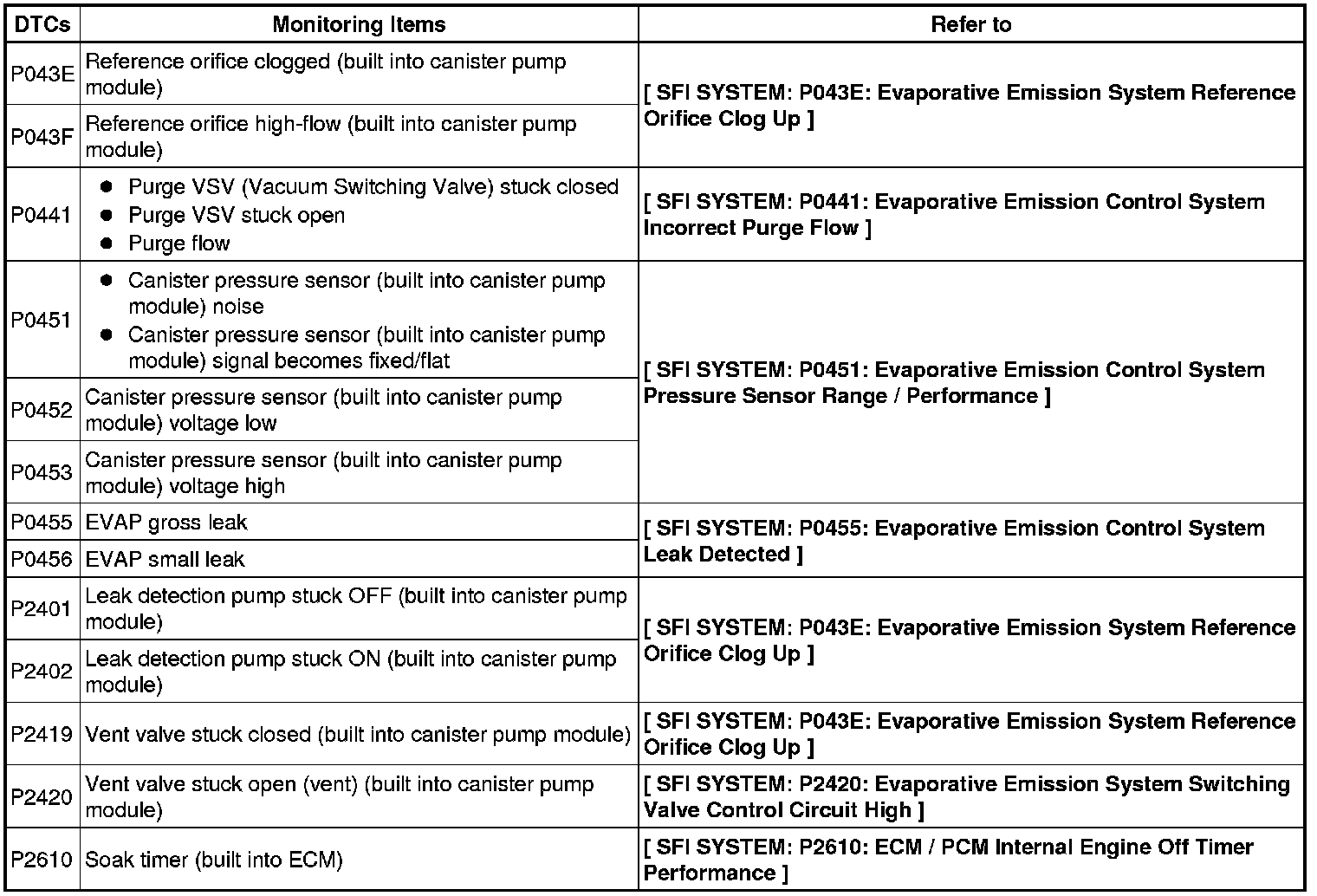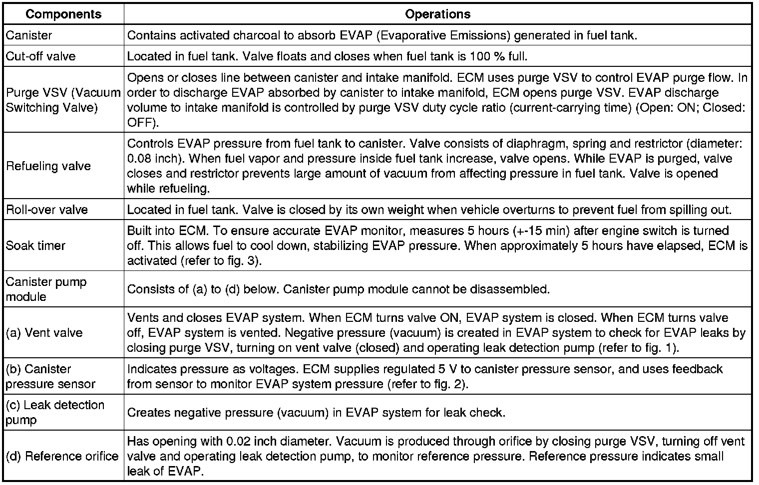 The leak detection pump creates negative pressure (vacuum) in the EVAP system and the pressure is measured. Finally, the ECM monitors for leaks from the EVAP system, and malfunctions in both the canister pump module and purge VSV, based on the EVAP pressure.