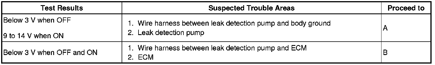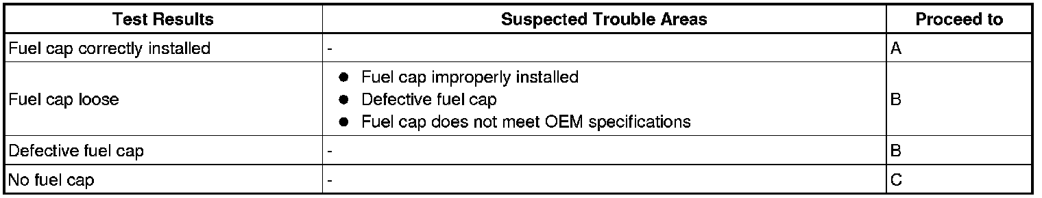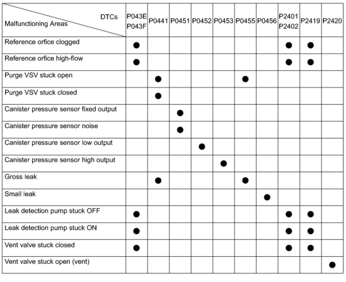 If any EVAP system DTCs are set, the malfunctioning area can be determined using the table below.