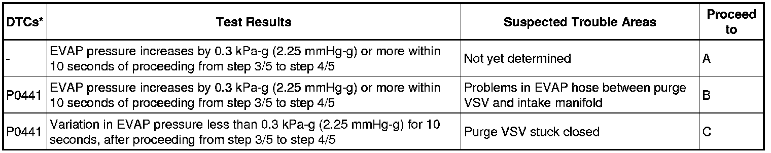 The vent valve is turned OFF (open) and the EVAP pressure is measured. If the variation in the pressure is less than 0.5 kPa-g (3.75 mmHg-g), the ECM interprets this as the purge VSV being stuck closed, and illuminates the MIL and sets DTC P0441 (2 trip detection logic).