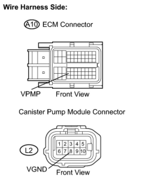(c) Measure the resistance between the VPMP terminal of the ECM connector and the VGND terminal of the canister pump module connector.