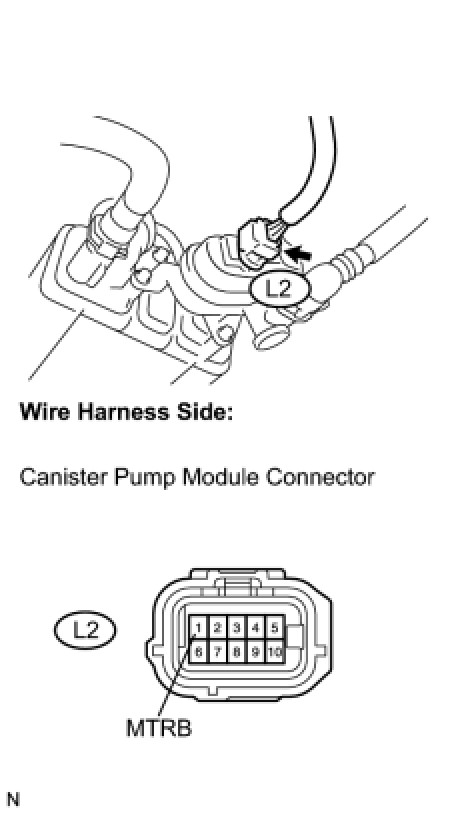(e) Measure the voltage between the MTRB terminal of the canister pump module connector and body ground when the leak detection pump is turned ON and OFF using the tester.