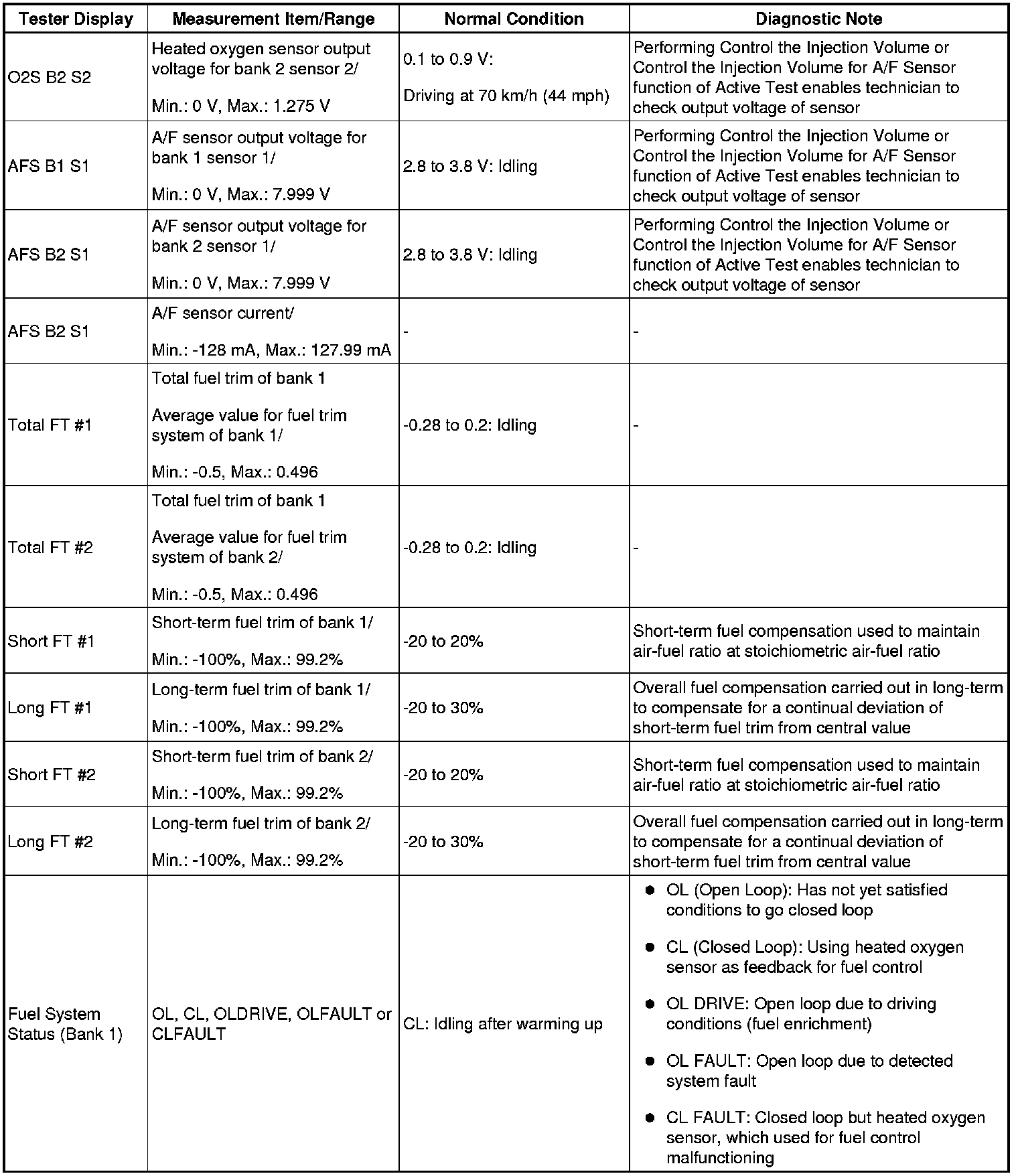 - *: Data List values are displayed only when performing the following Active Test: Control the VVT Linear (Bank 1 or Bank 2) or Control the VVT Exhaust Linear (Bank 1 or Bank 2). For other Active Test, the Data List value will be 0.