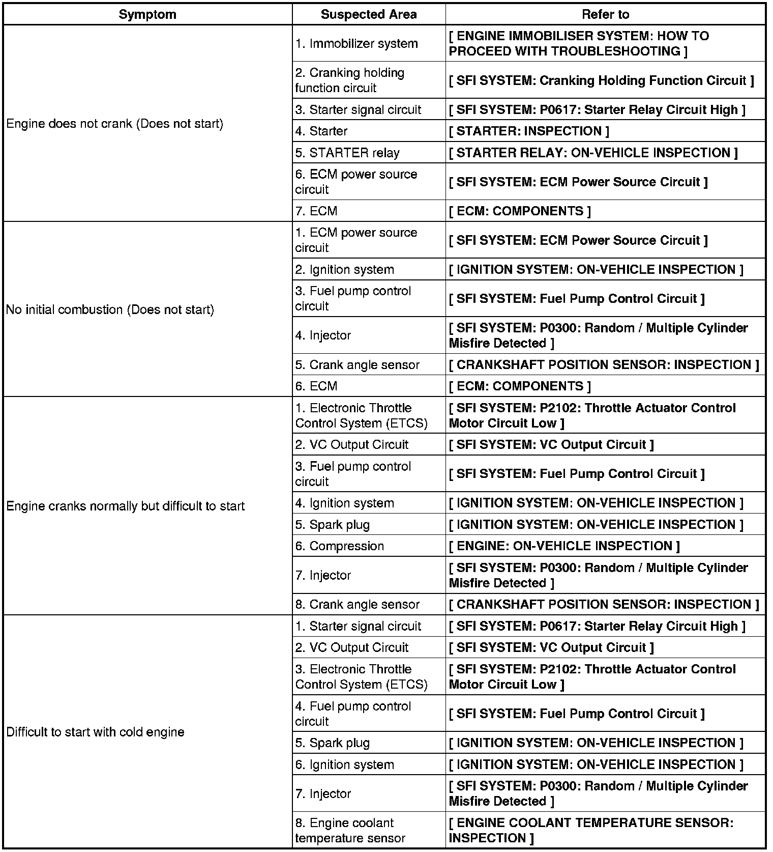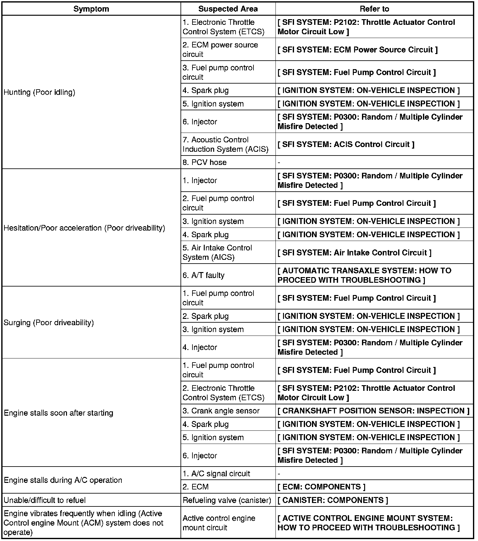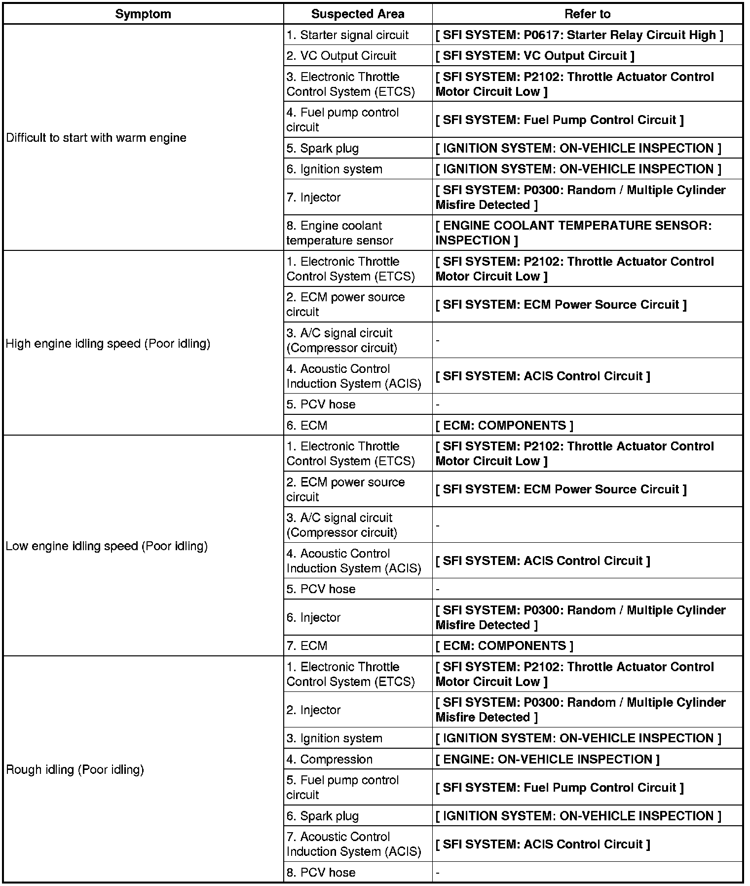 HINT: When a malfunction is not confirmed by a DTC (Diagnostic Trouble Code) check and the cause of problem cannot be identified through a basic inspection, troubleshoot according to the priority order indicated in the table below.