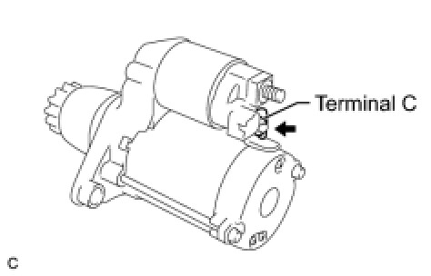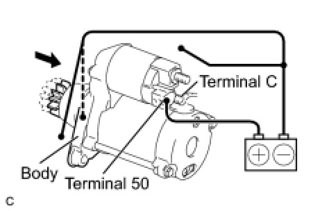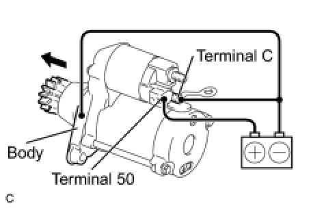 (1) Disconnect the negative (-) terminal lead from terminal C under the conditions for pull-in test. Check that the pinion gear remains out.