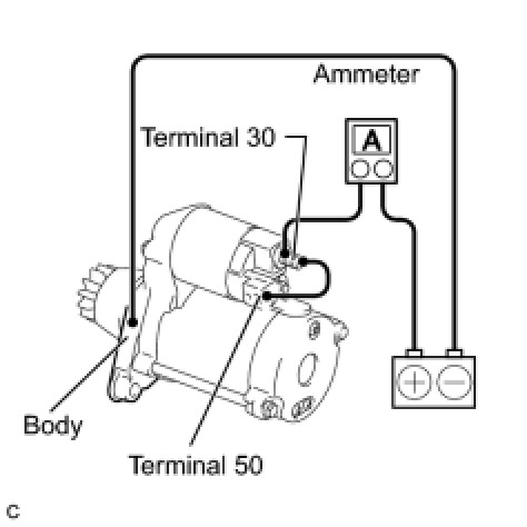 (3) Connect the battery and an ammeter to the starter as shown in the illustration.