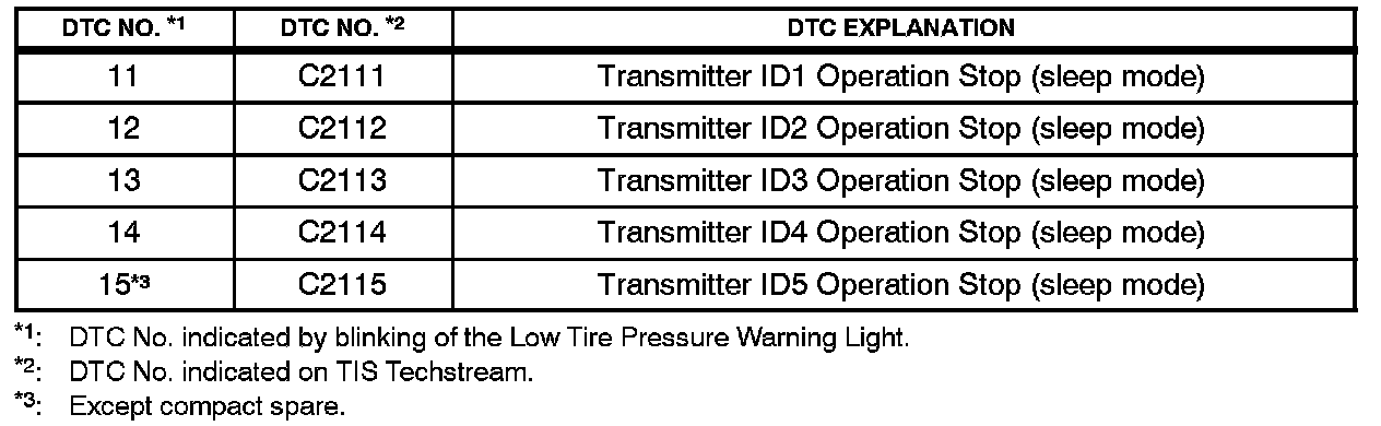 ^ The Diagnostic Trouble Codes (DTCs) shown may be stored in the TPWS ECU until the tire pressure warning valves/sensors are activated.