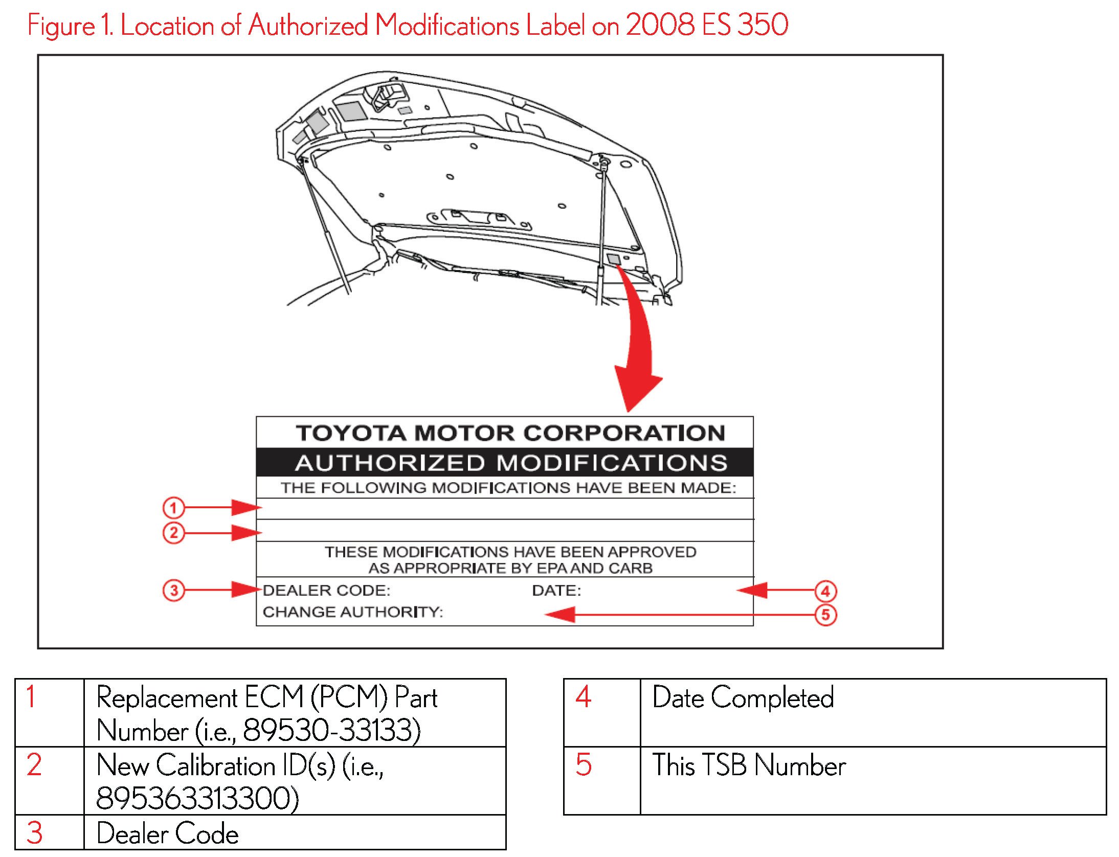 1. Check for the Authorized Modifications Label affixed to the vehicle in the location shown in Figure 1. Confirm if the TCM calibration has been updated. If the calibration ID listed is NOT the latest TCM calibration - go to step 2.