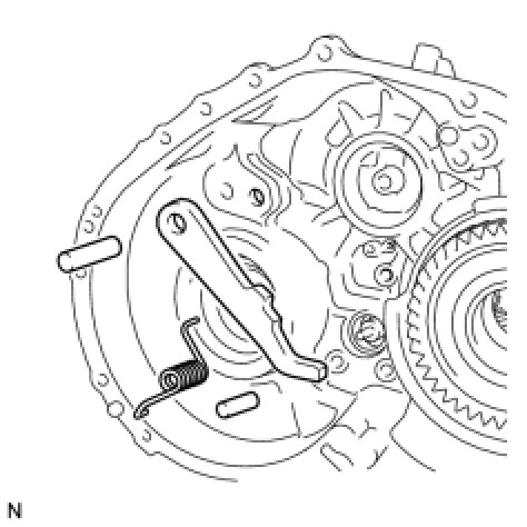 (a) Remove the spring, parking lock pawl pin, parking lock pawl shaft, and parking lock pawl from the transaxle case.