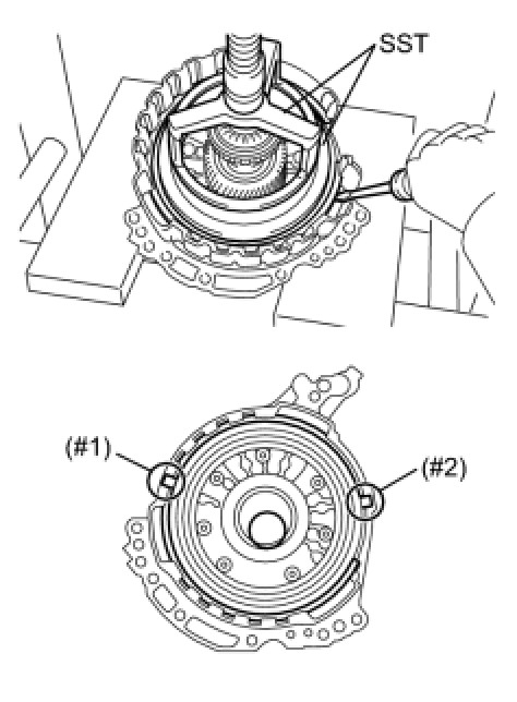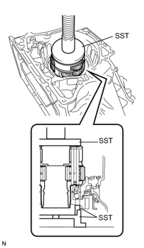 (b) Place SST on the 1st and reverse brake return spring and compress the 1st and reverse brake return spring with a press.