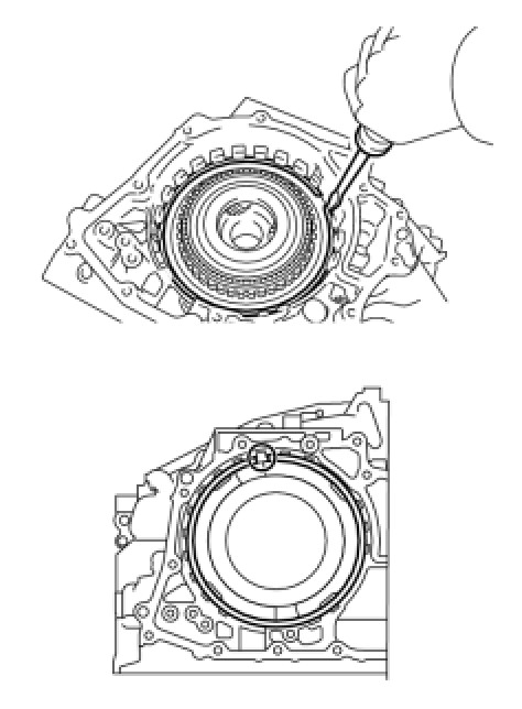 - Be sure to align the opening ends of the snap ring with the protrusions on the transaxle case as shown in the illustration.