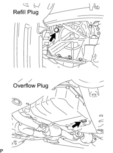 (d) Remove the refill plug and overflow plug.