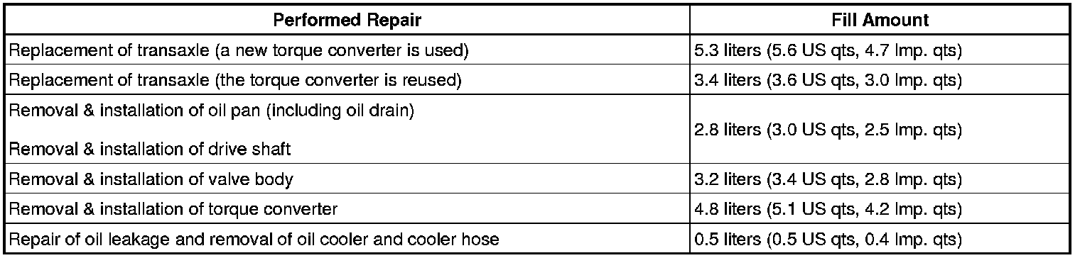 (a) Fill the transaxle with the correct amount of fluid as listed in the table below.