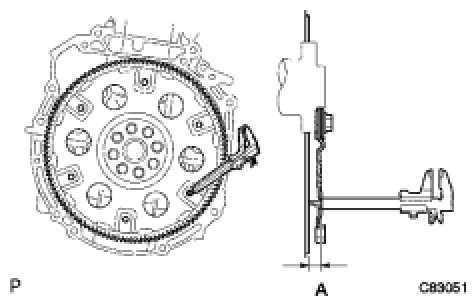 (d) Using vernier calipers and a straightedge, measure dimension "A" between the transaxle fitting part of the engine and the converter fitting part of the drive plate (*1).