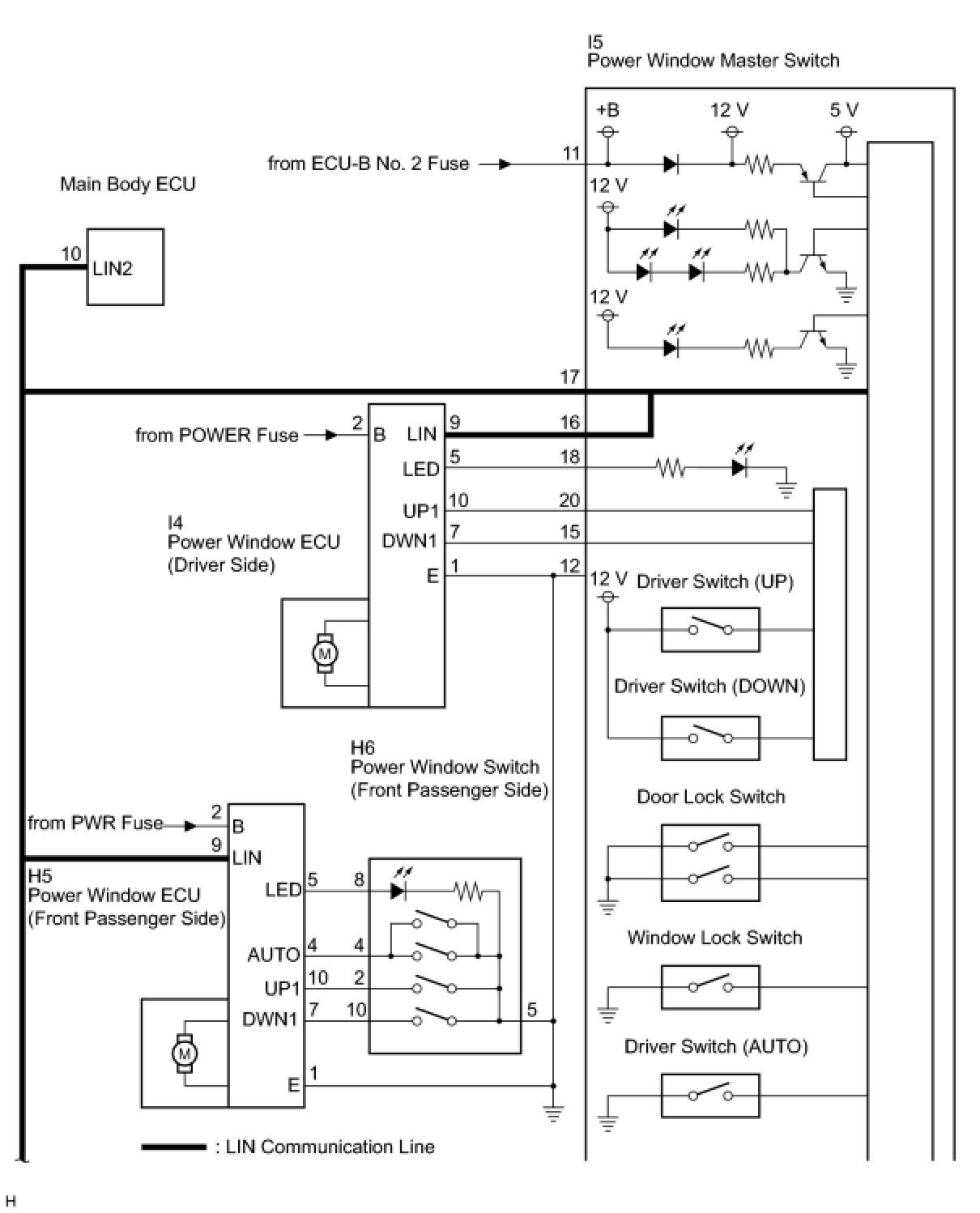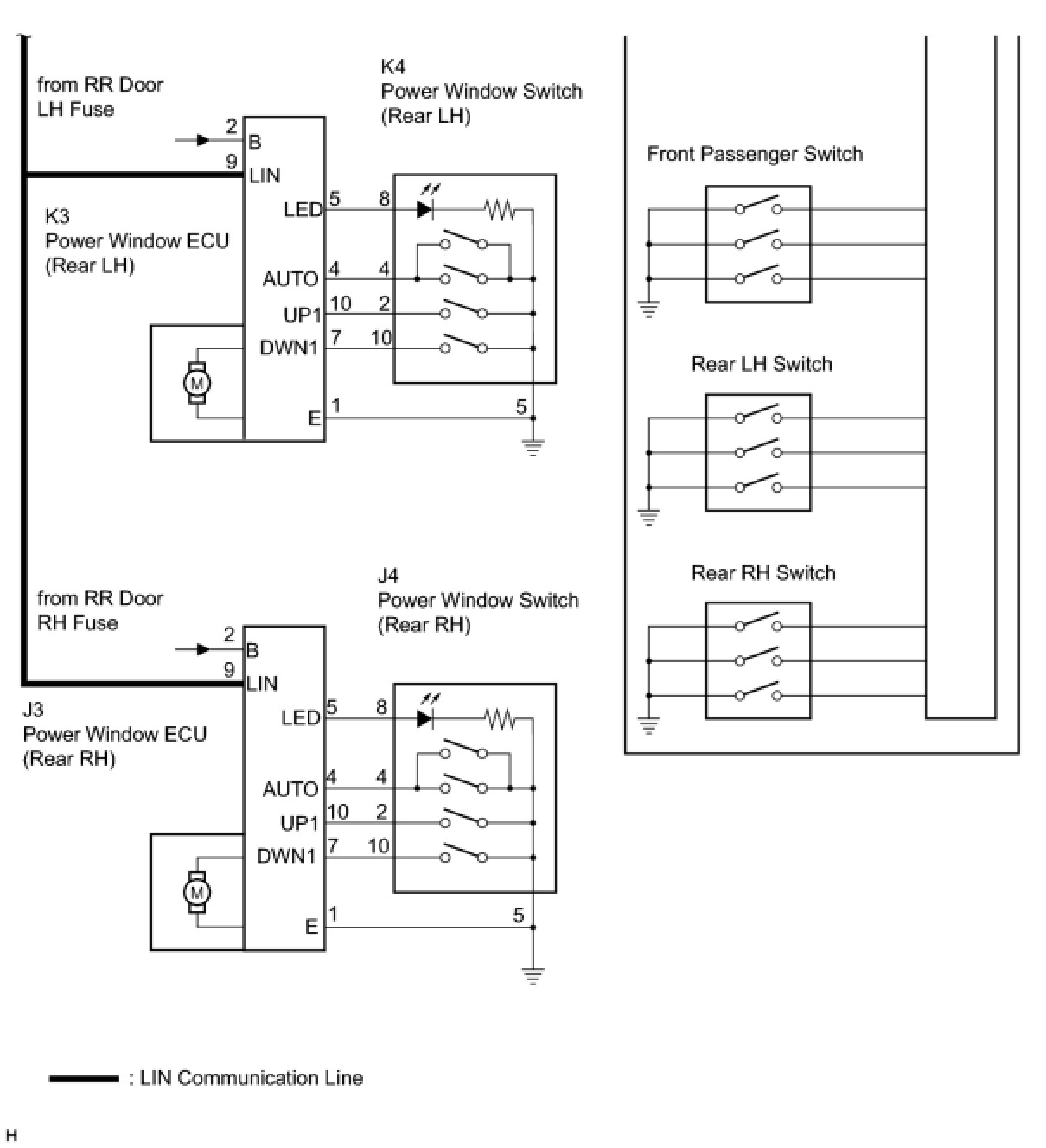 (a) The power window control system controls the power window operation using the power window regulator motors. The main controls of this system are the power window regulator master switch, which is mounted on the driver side door, and the power window regulator switches, which are mounted on the passenger side door and rear doors. Operating a window switch results in electrical power being transmitted to the corresponding power window regulator motor.
