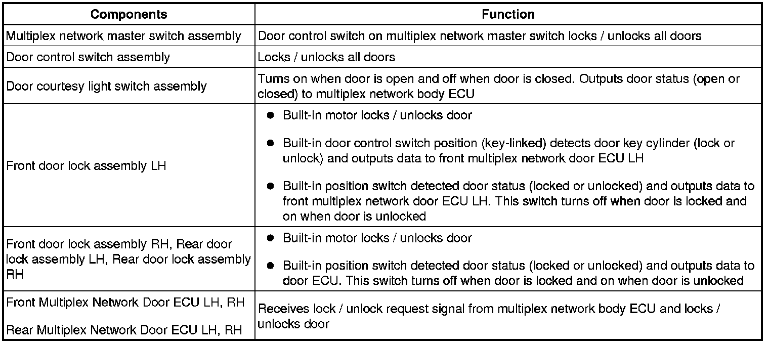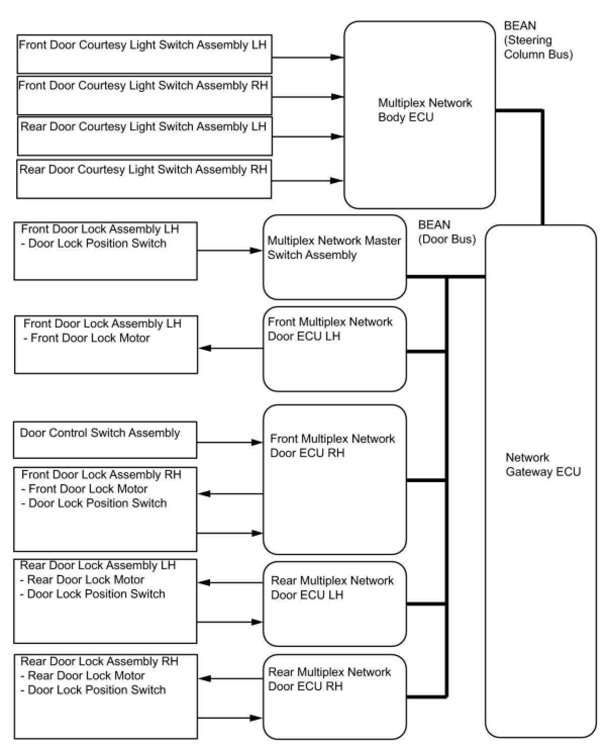 - The door control switch of the multiplex network master switch and the driver door key cylinder use the BEAN line to send lock / unlock request signals through the multiplex network master switch to the multiplex network body ECU.