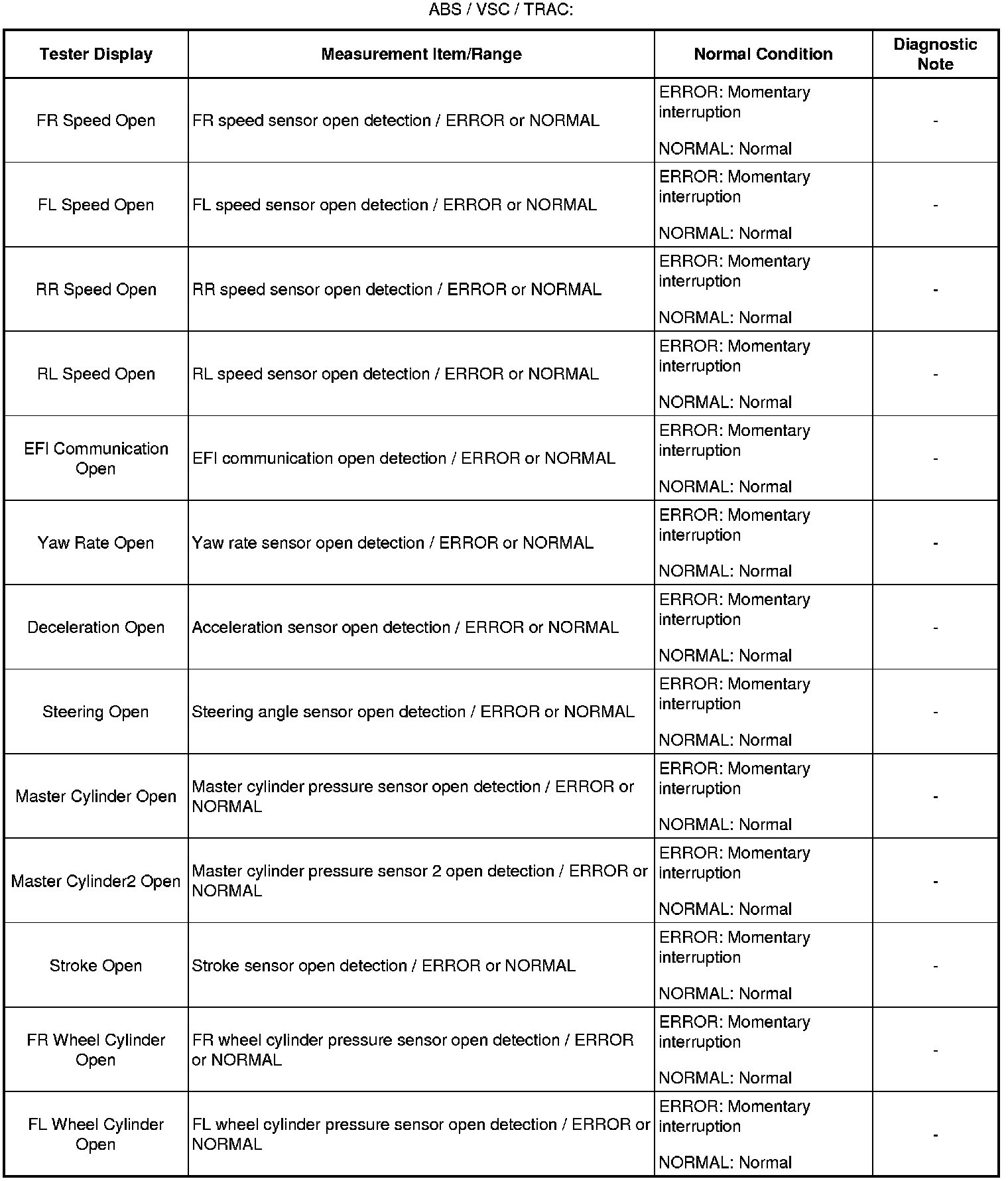A momentary interruption (open circuit) in the connectors and/or wire harness between the sensors and ECUs can be detected in the ECU Data List function of the Techstream.