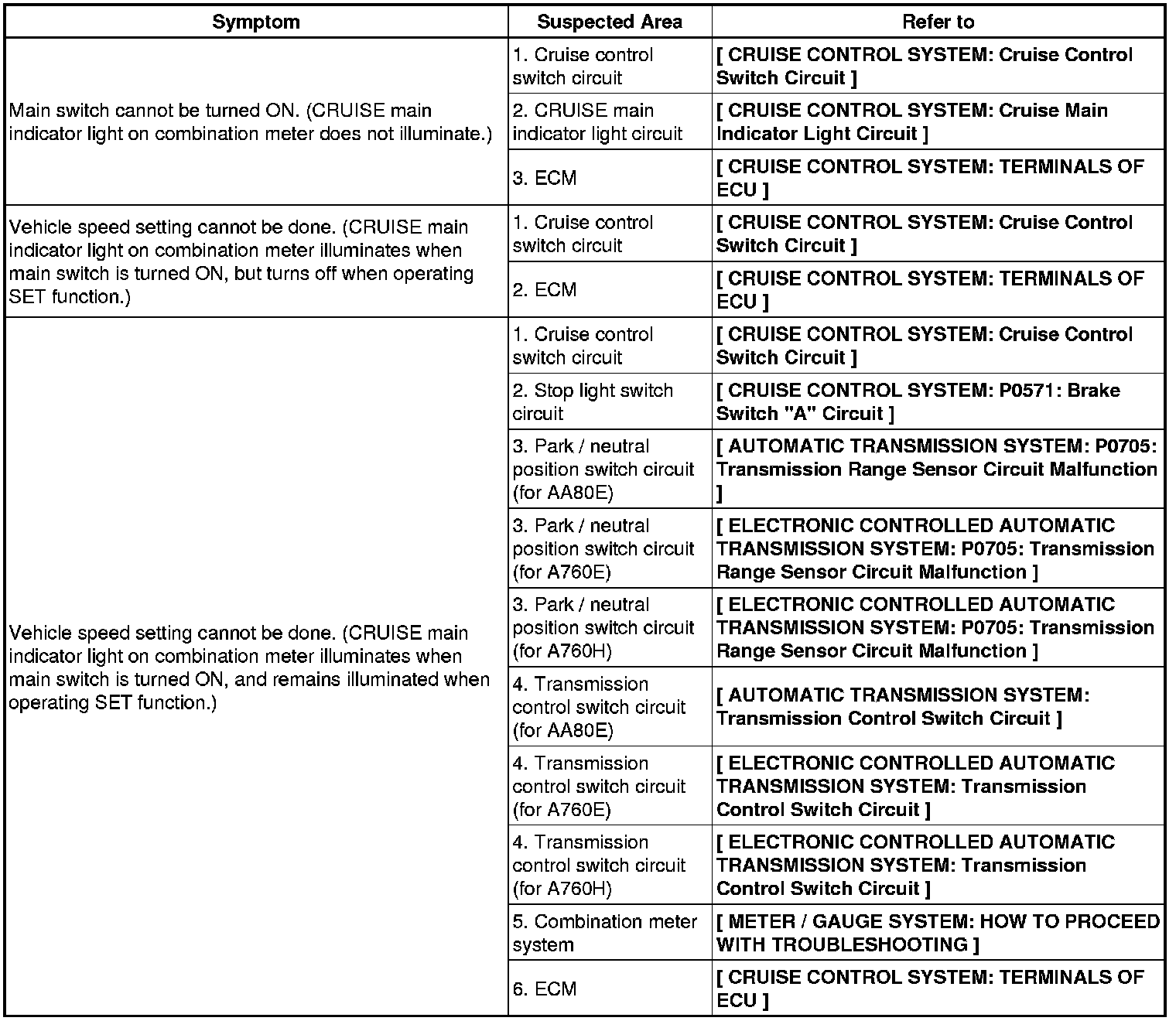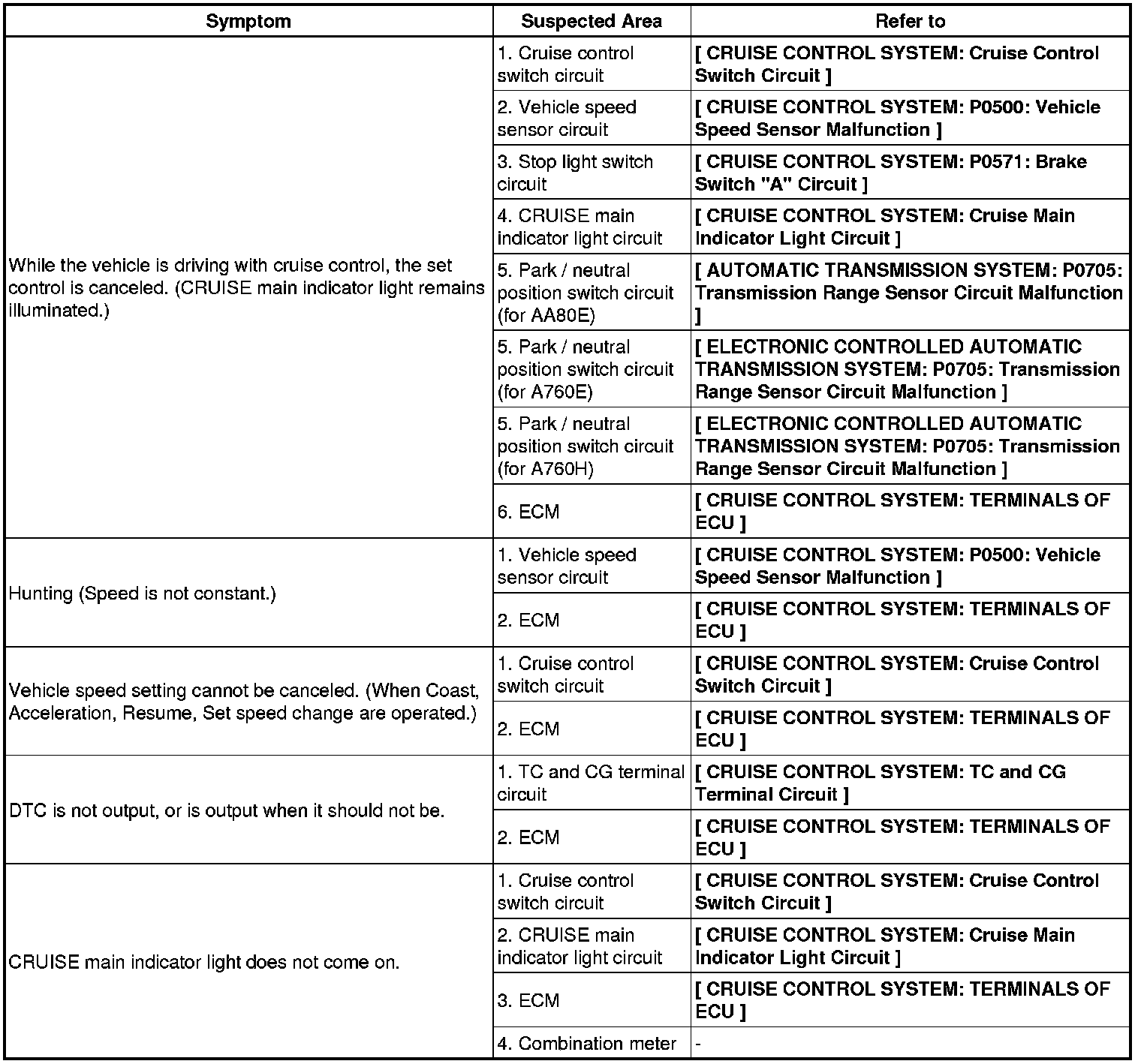 : CRUISE CONTROL SYSTEM: PROBLEM SYMPTOMS TABLE
