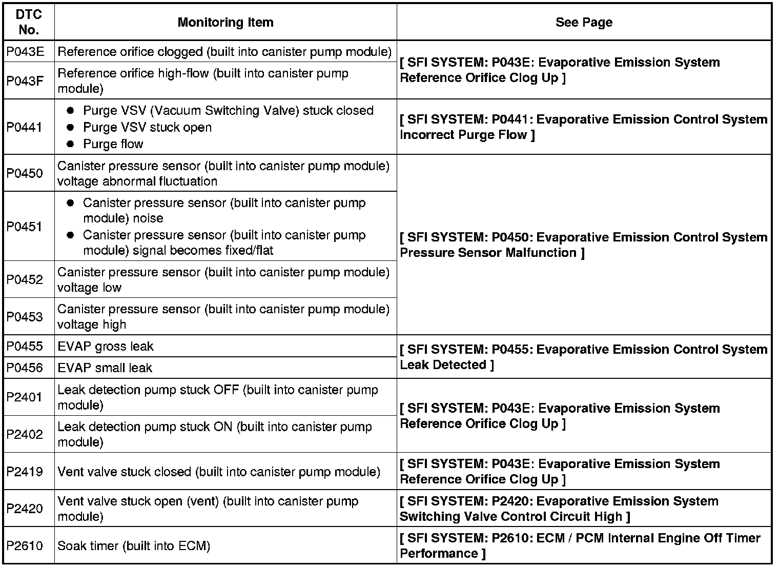 The leak detection pump creates negative pressure (vacuum) in the EVAP system and the pressure is measured. Finally, the ECM monitors for leaks from the EVAP system, and malfunctions in both the canister pump module and purge VSV, based on the EVAP pressure.