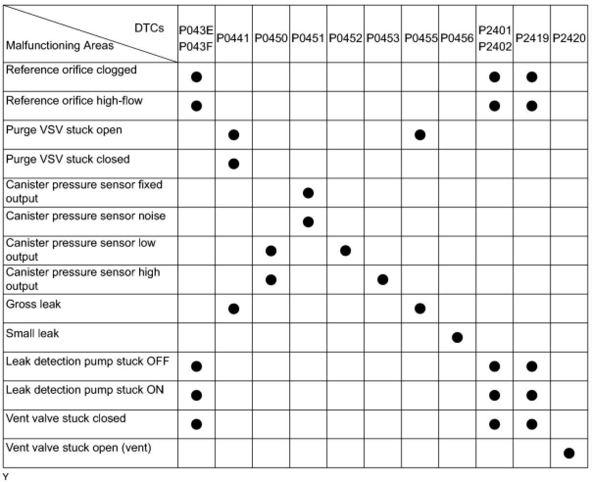 If any EVAP system DTCs are set, the malfunctioning area can be determined using the table below.