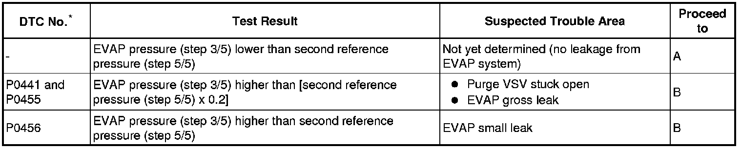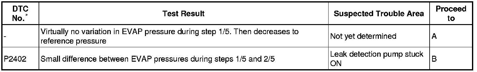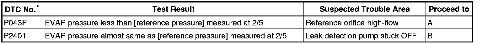 If the reference pressure difference between the first and second checks is greater than the specification, all the DTCs relating to the reference pressure (P043E, P043F, P2401, P2402 and P2419) are stored.