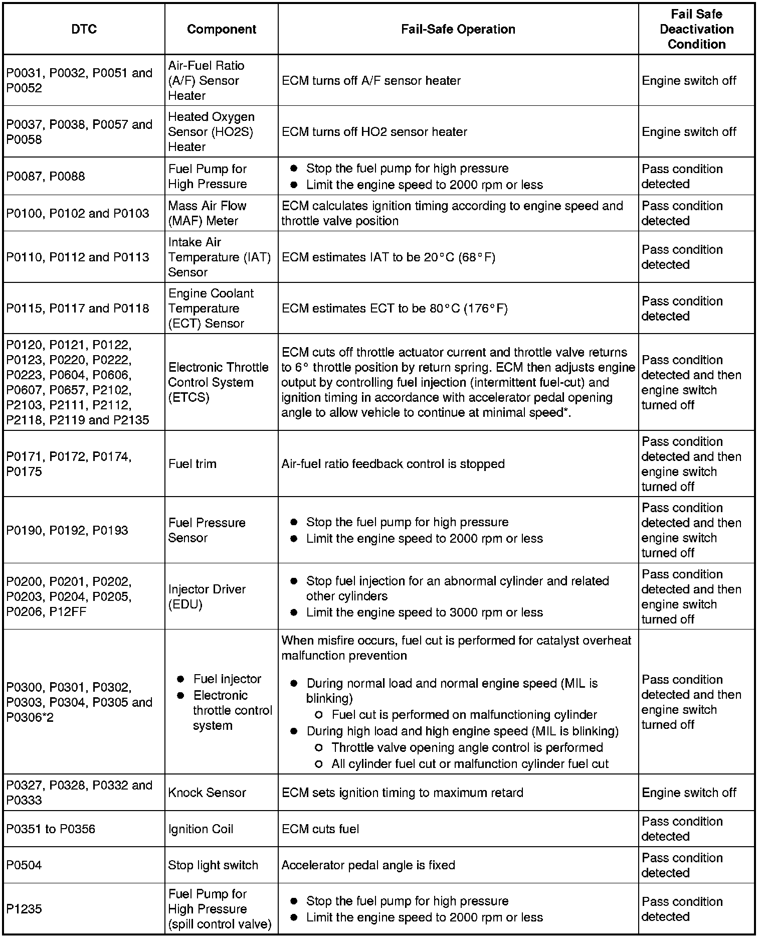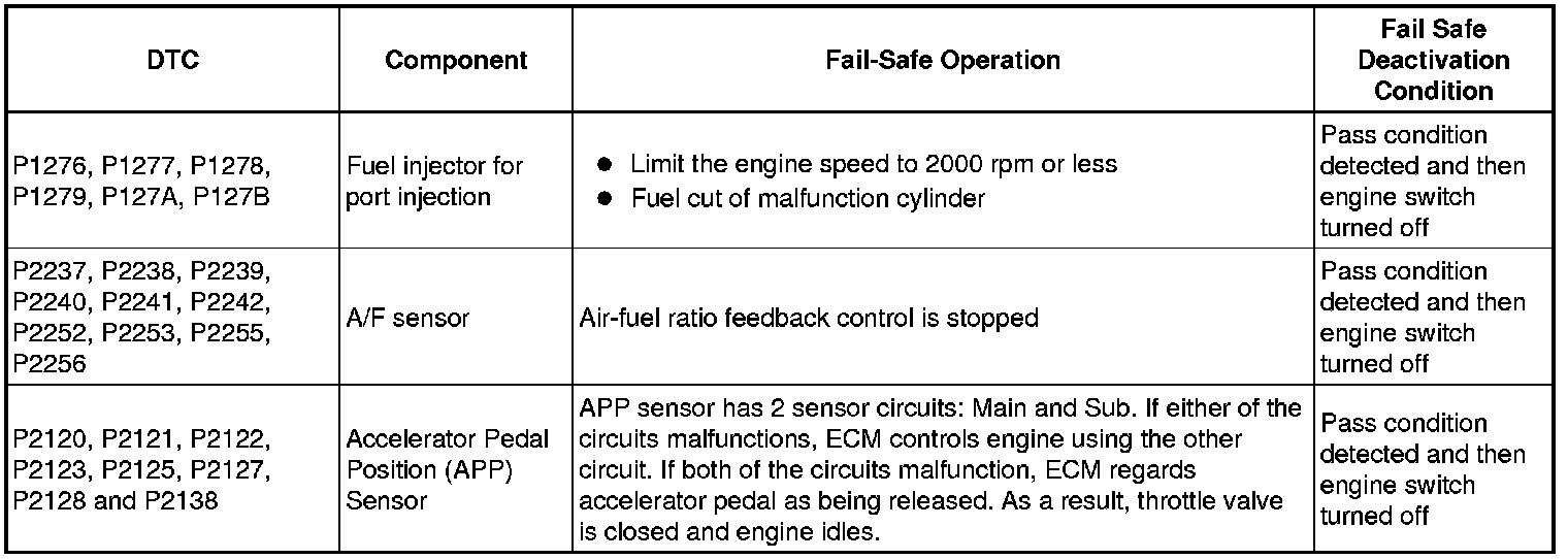 If any of the following DTCs are set, the ECM enters fail-safe mode to allow the vehicle to be driven temporarily.